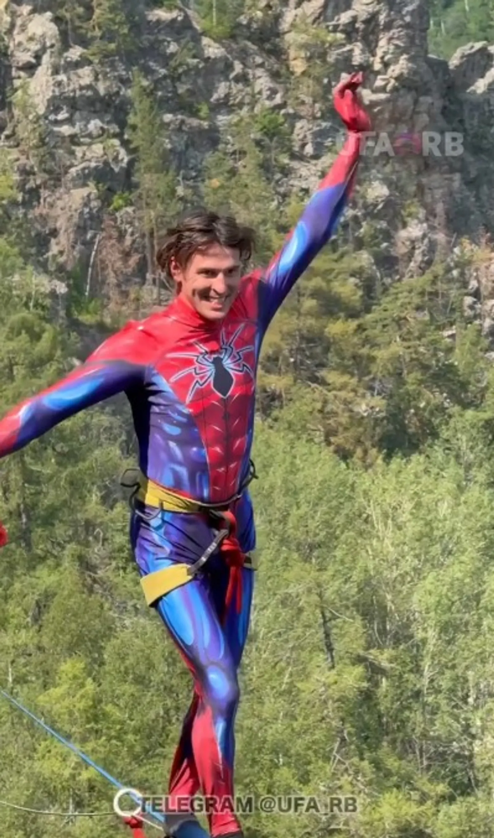 На Айгирских скалах заметили экстремала в костюме Человека-паука, который прошелся по канату, натянутому над пропастью. Трюк выполнялся на высоте более 600 метров над уровнем моря, что примерно соответствует высоте 200-этажного здания. По тросу прошелся спортсмен Сергей Шилов.