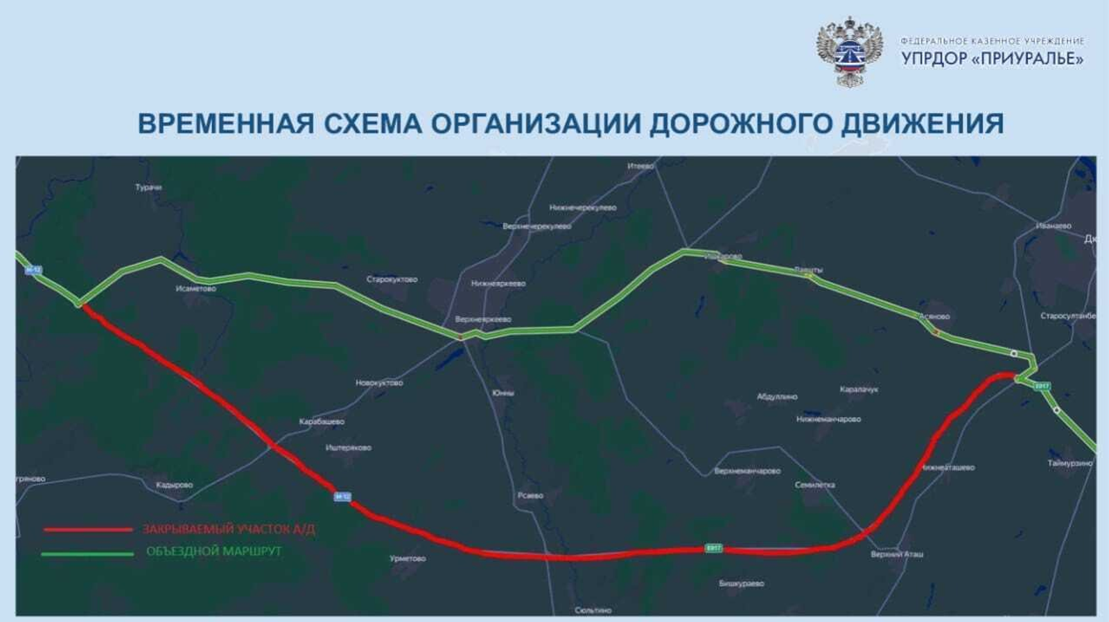 Ещё на месяц продлено ограничение движения на участке трассы М-7 «Волга» в обход посёлков Исаметово, Верхнеяркеево, Лаяшты, Ишкарово и Асяново. Здесь настраивают автоматическую систему управления дорожным движением.