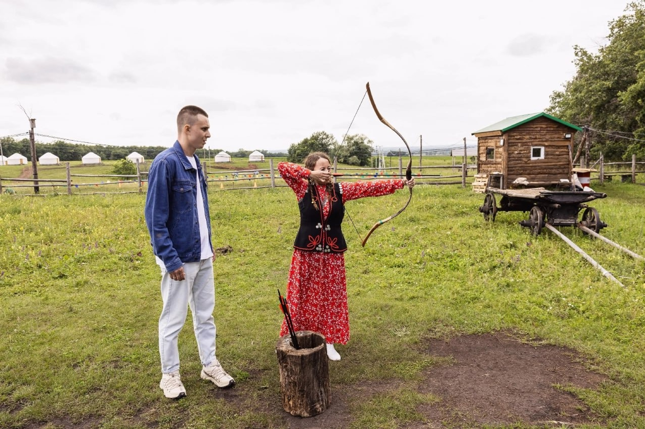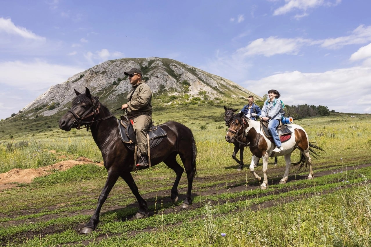 В геопарке «Торатау» участники поднялись на шихан, покатались на башкирских лошадях и соревновались в традиционных играх сабантуя на колодно-бортевой пасеке у подножия горы.