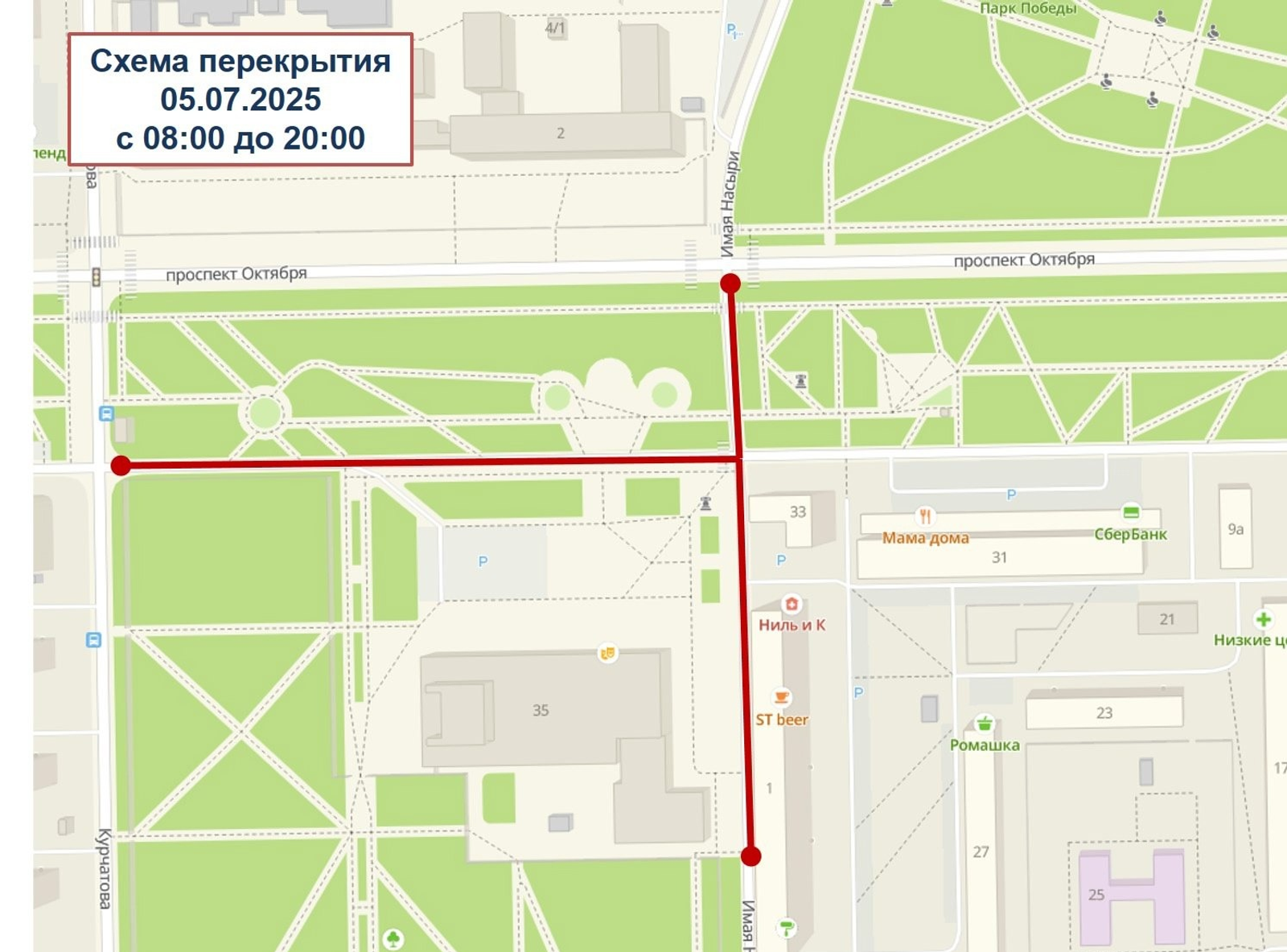 5 июля в связи с проведением фестиваля «Халяль-фест» с восьми утра до восьми вечера перекроют движение по ул. И. Насыри на участке от дома № 1 до пересечения с пр. Октября; и по малому пр. Октября — от дома № 33 до пересечения с ул. Курчатова.