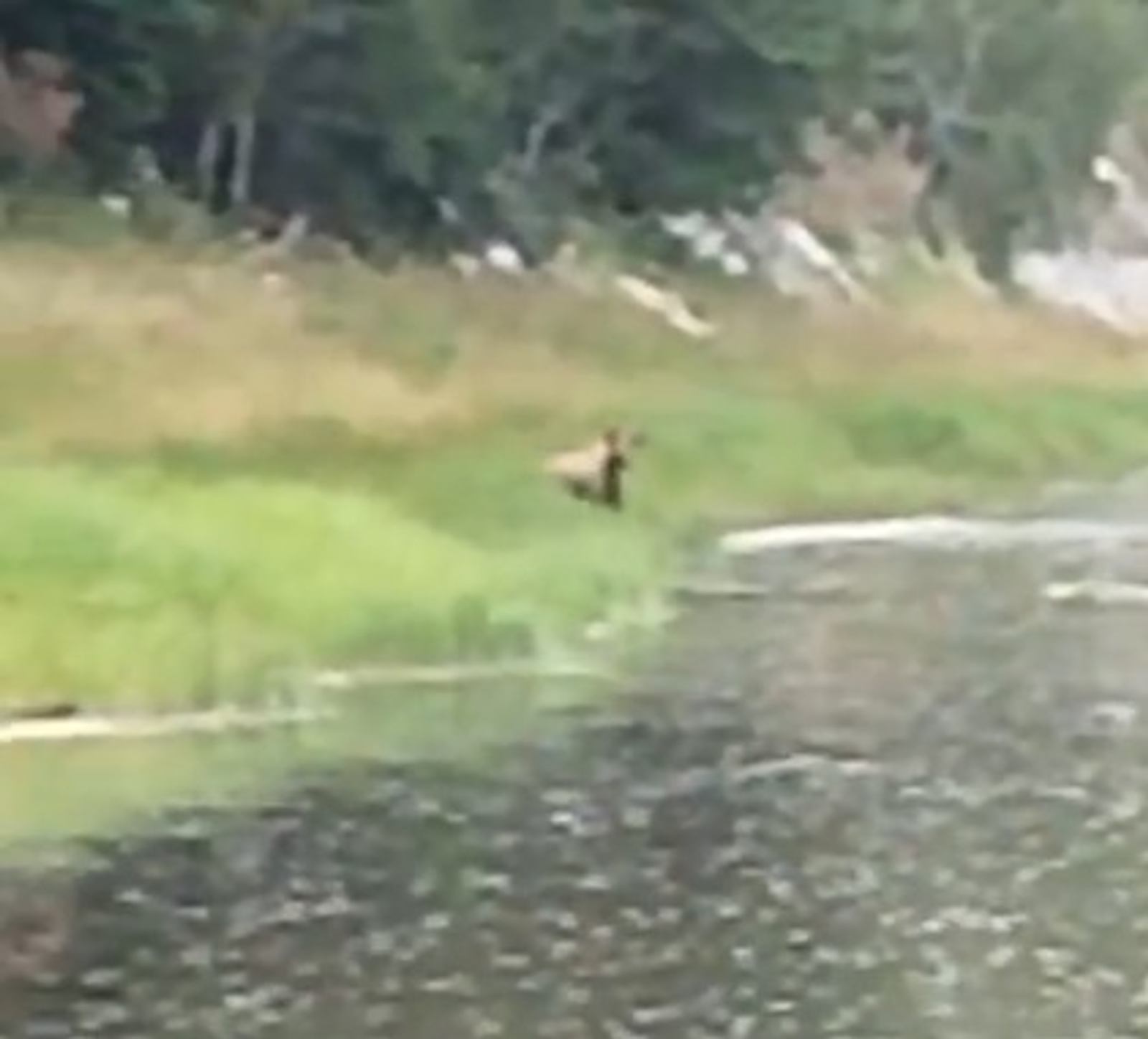На видео видно, как медведь испугался шумной компании. Он вышел на берег и убежал в лес.