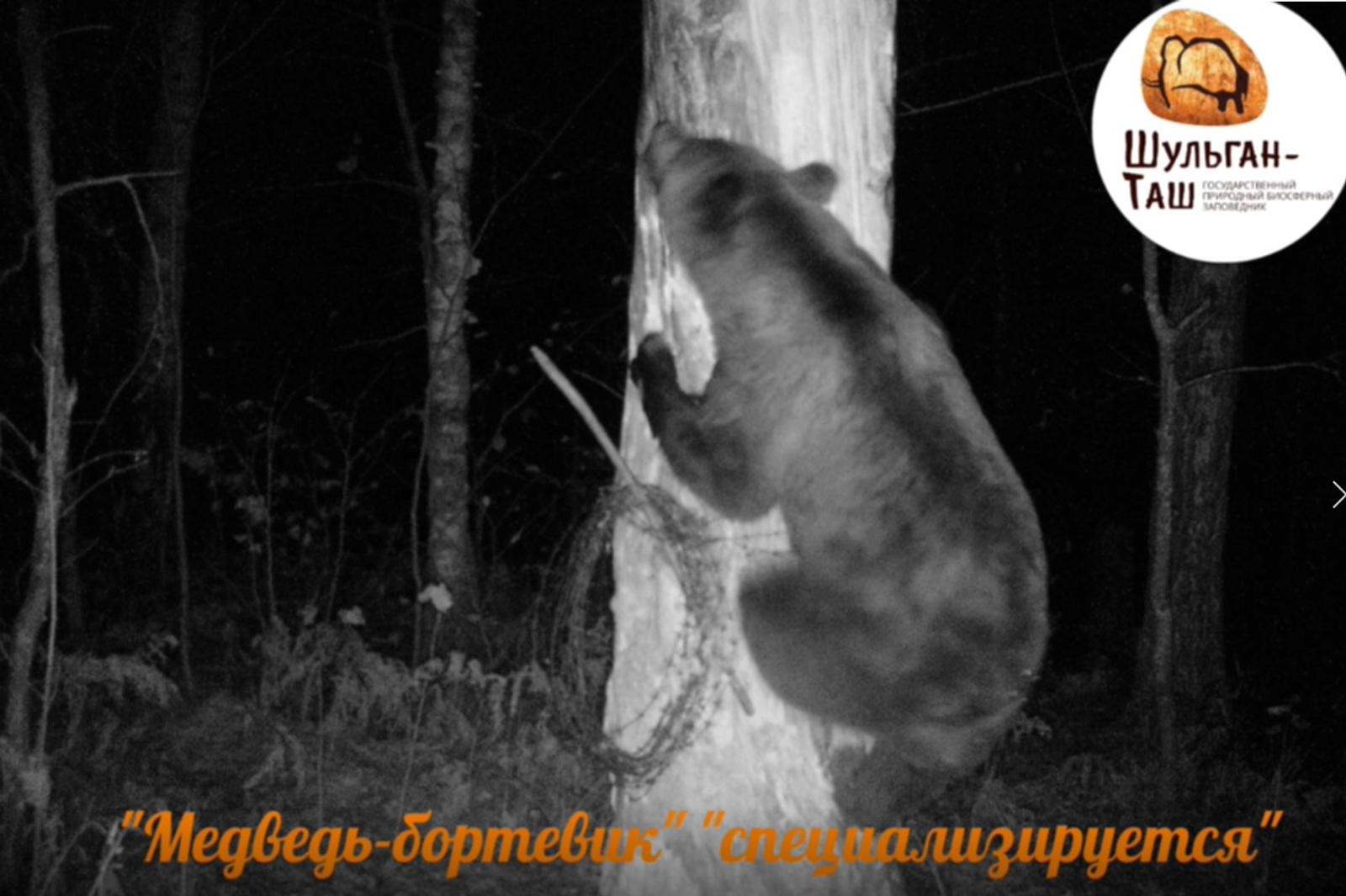 «Это снято на фотоловушки несколько лет назад. Медведя жалили пчелы, мешал тукмак, но он не сдавался – спускался и поднимался к борти примерно 200 раз! Об этом свидетельствует количество снятых кадров. Колючая проволока, которой бортевик в целях защиты от медведя обмотал ствол дерева, тоже не испугала», – пояснил директор заповедника Михаил Косарев.