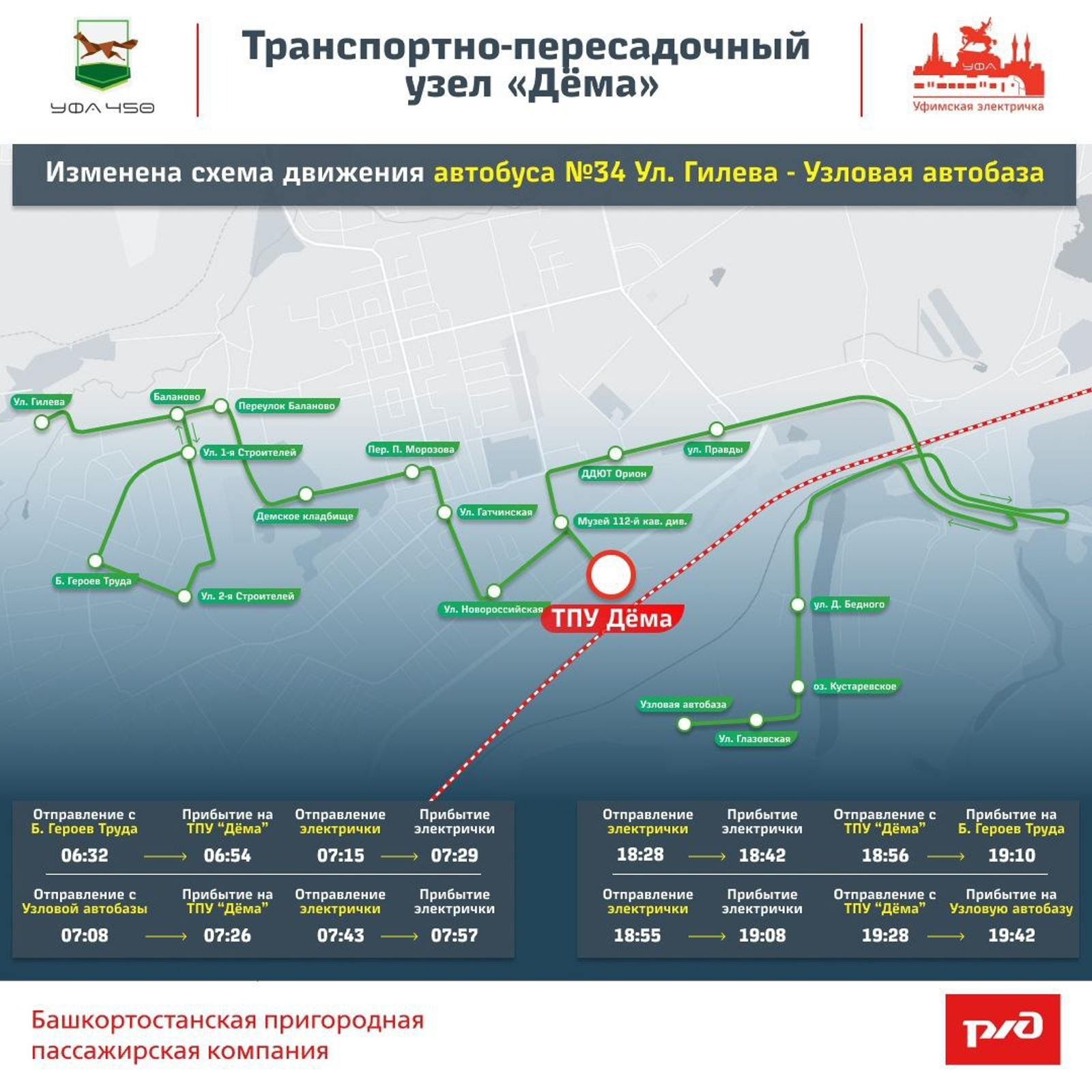 Так, автобус №34 (ул. Гилева – Узловая автобаза) будет отправляться с остановки Б. Героев Труда в 6.32 и 7.08 и прибывать на дёмский вокзал в 6.54 и 7.26.