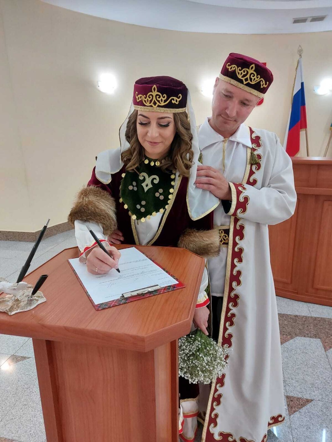 Необычная свадьба прошла в ЗАГСе города Салавата. Там расписалась пара, которая живет в Ханты–Мансийском автономном округе. Вместо традиционных нарядов – костюма и белого платья – жених Эдуард Фаткуллин и невеста Людмила Старченко пришли в башкирских национальных костюмах. Хотя оба они родом не из нашей республики. Жених родился в Тюменской области, невеста – в Омской области.