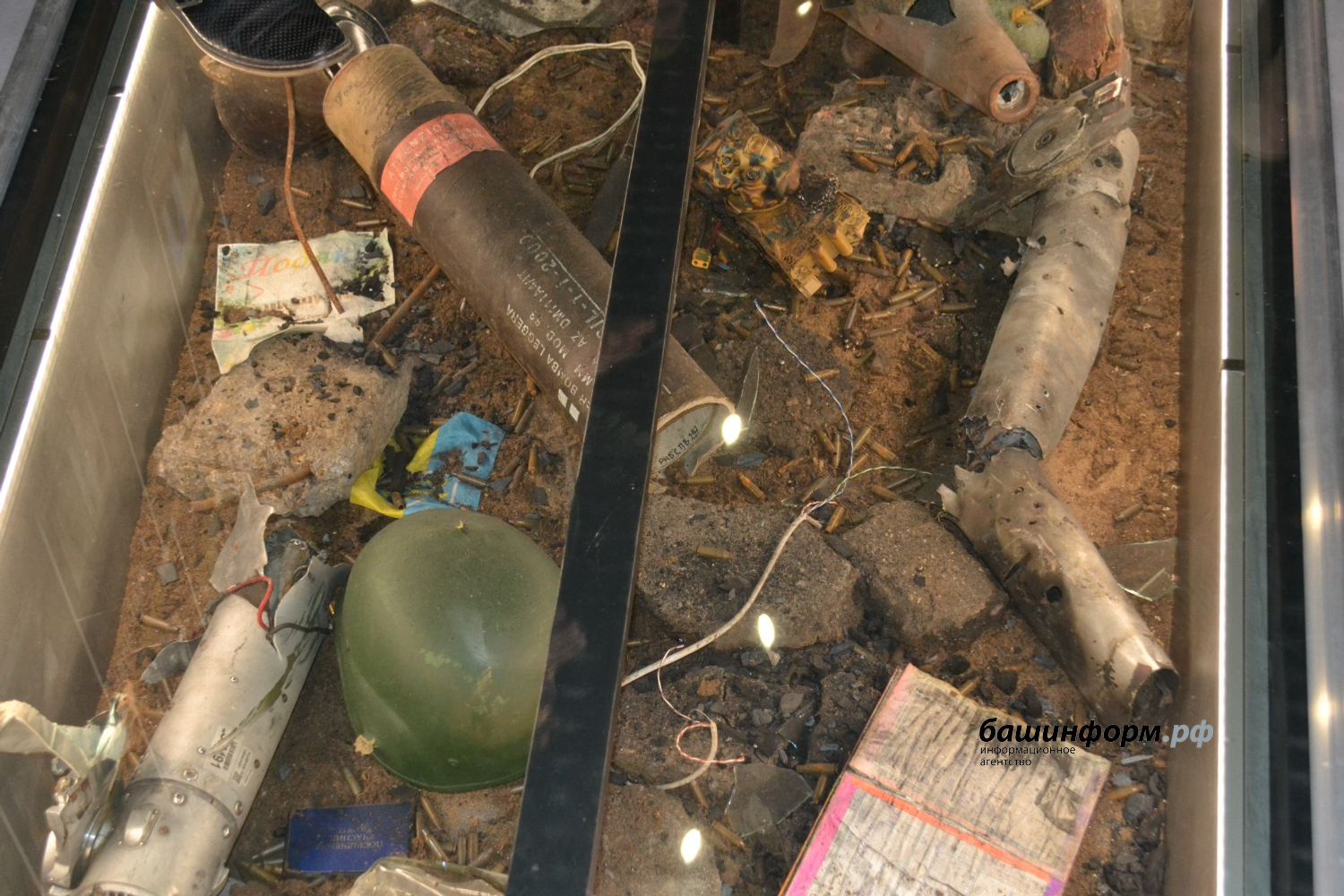 В витринах и нишах выставлены более 100 подлинных предметов, привезённых из зоны боевых действий: фрагменты оружия, военная форма, личные вещи бойцов, трофейные предметы.