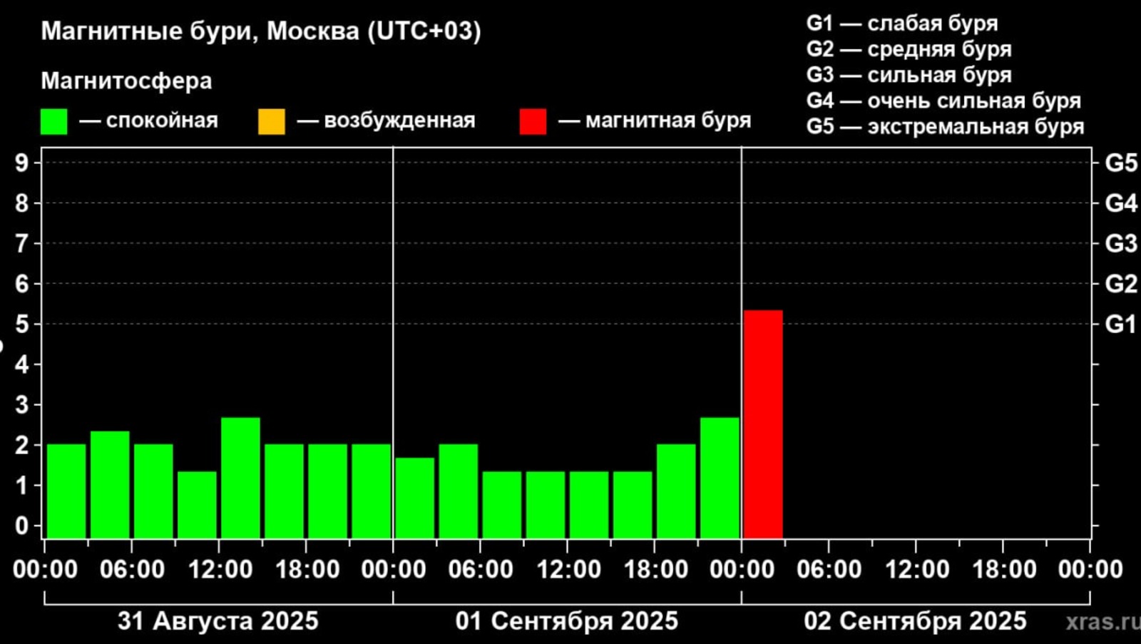 На Земле официально, по данным мировой сети станций, начались магнитные бури планетарного масштаба. В ближайшие часы геомагнитный индекс почти наверняка будет расти, так как с некоторых станций уже поступают данные о бурях уровня G2-G3.