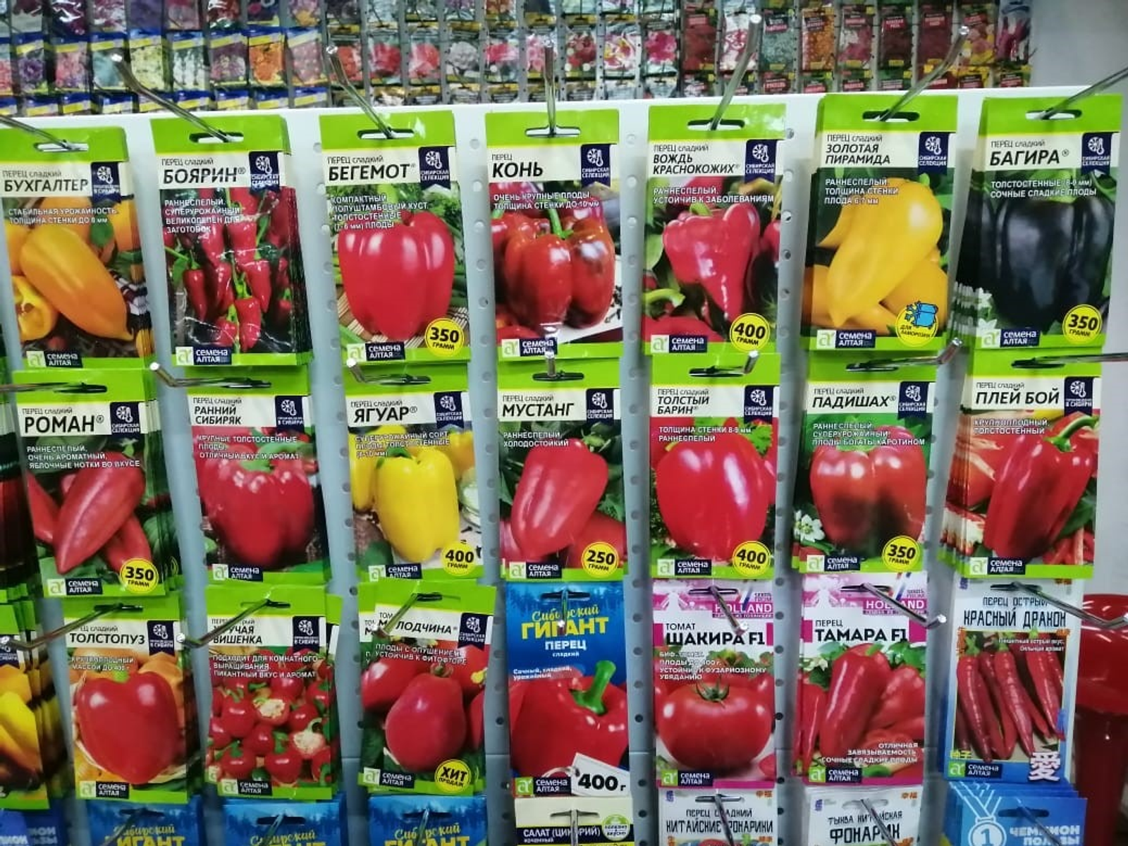 Среди них такие сорта томатов, как Лимончело, Апельсиновый джем, Веселые гондурасы, Гаргамель, Кабаняка, Курочка-несушка, Конь-огонь; перца сладкого: Татарин, Примерный муженек; свеклы столовой: тетя Мотя; моркови: Дон Кихот, Страна чудес; огурца: Селедочка, Северный поток, Дедушкин внучок, Змей искуситель и другие.