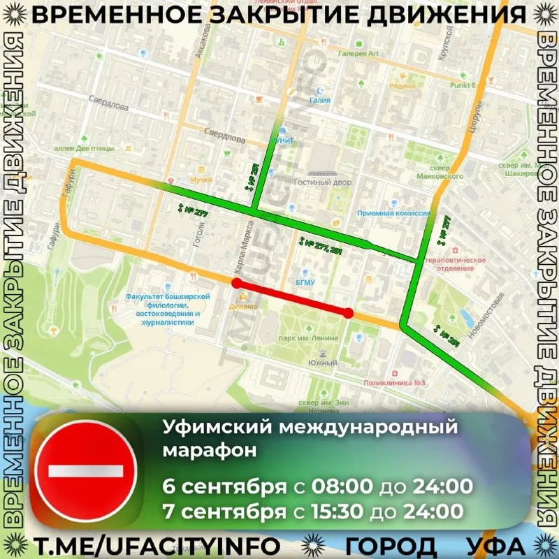 Так, с 8. 00 6 сентября до 24.00 7 сентября для проезда закрыт участок улицы Заки Валиди от Карла Маркса до Советской. В воскресенье, 7 сентября, с 00:00 до 16:00 перекроют улицы Карла Маркса и Тукаева вдоль стадиона «Динамо», а с 5:00 до 15:30 ограничение будет действовать по маршруту от старта напротив стадиона «Динамо» и далее, включая улицы: Советскую, Пушкина, Карла Маркса, Достоевского, Мустая Карима, Коммунистическую, Ленина, Краснодонскую, Гоголя, Гафури и Тукаева.
