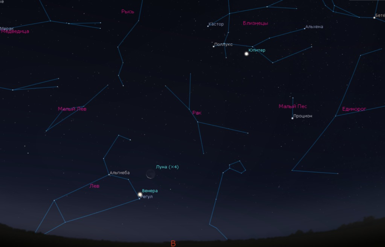 Под Венерой будет видна ещё одна яркая звездочка — это Регул — самая яркая звезда во Льве.