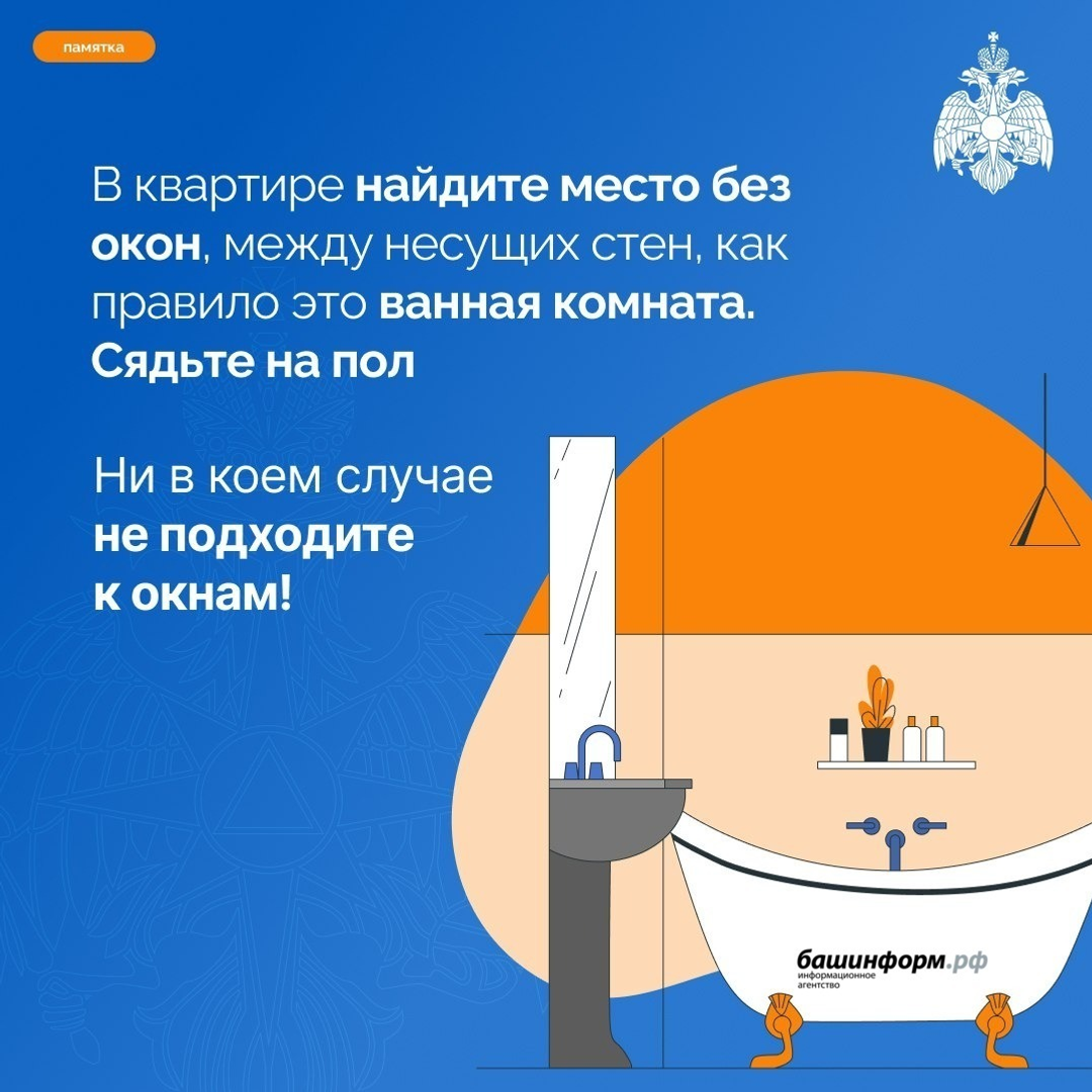 Если гражданин в квартире, нужно найти место без окон между несущих стен. Как правило, это ванная комната. Здесь нужно сесть на пол. Ни в коем случае нельзя подходить к окнам, советуют в пресс-службе ведомства.
