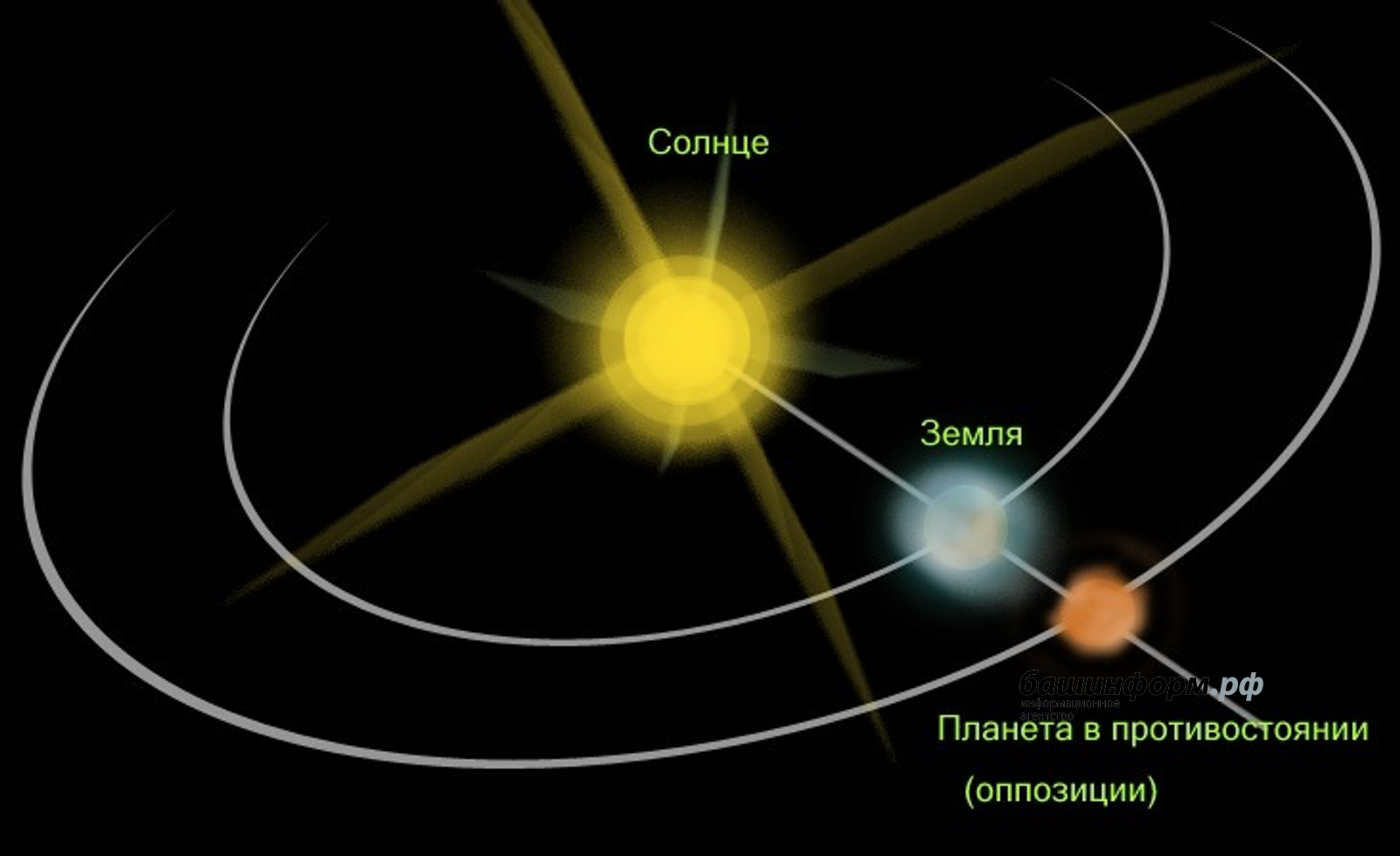 «Противостоянием называют такое положение планеты на орбите, когда она оказывается на одной прямой с Землей и Солнцем, причем Земля находится между планетой и Солнцем. Для земного наблюдателя планета в противостоянии отстоит от Солнца на 180 градусов и восходит вечером в то время, когда Солнце заходит за горизонт, а заходит утром на западе с восходом Солнца, то есть видна всю ночь, и это самое благоприятное время для ее наблюдения», — пояснили в планетарии.