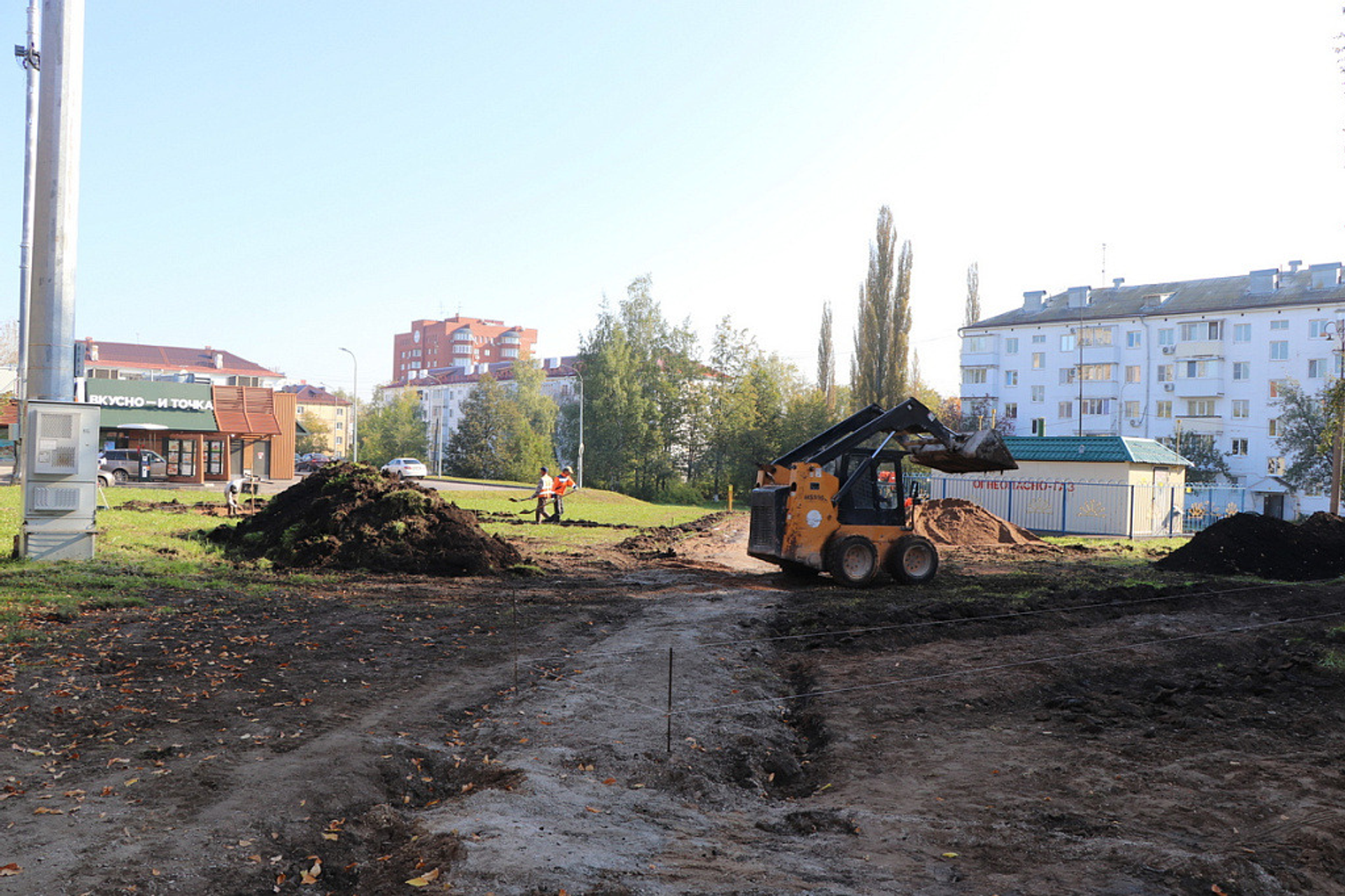 На сегодняшний день здесь демонтировали покрытие старых пешеходных дорожек и разметили контуры новых. Ведется подготовка основания тротуаров для укладки асфальта. В сквере высадят порядка 40 деревьев различных пород, а также установят скамейки, урны и обустроят газоны.