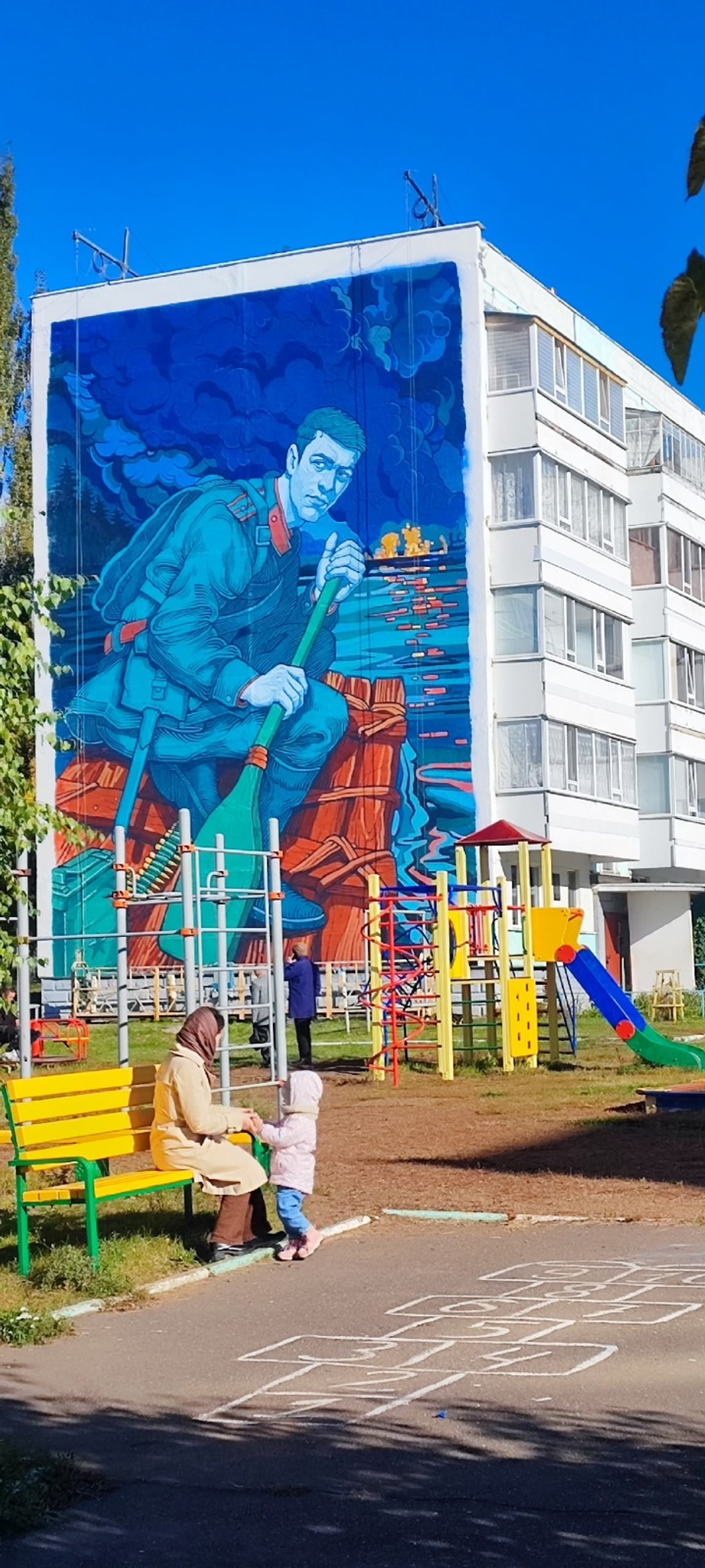 Как сообщил мэр города Денис Ирназаров, автором мурала под названием «Форсирование Днепра» стал художник Радик Мусин. На создание этого сюжета его вдохновил подвиг Героя Советского Союза Абдуллы Шагиева. 3 октября 1943 года красноармеец отличился при форсировании Днепра, первым переправившись на правый берег и в одиночку удерживая позицию в течение двух часов, проявив невероятное мужество.