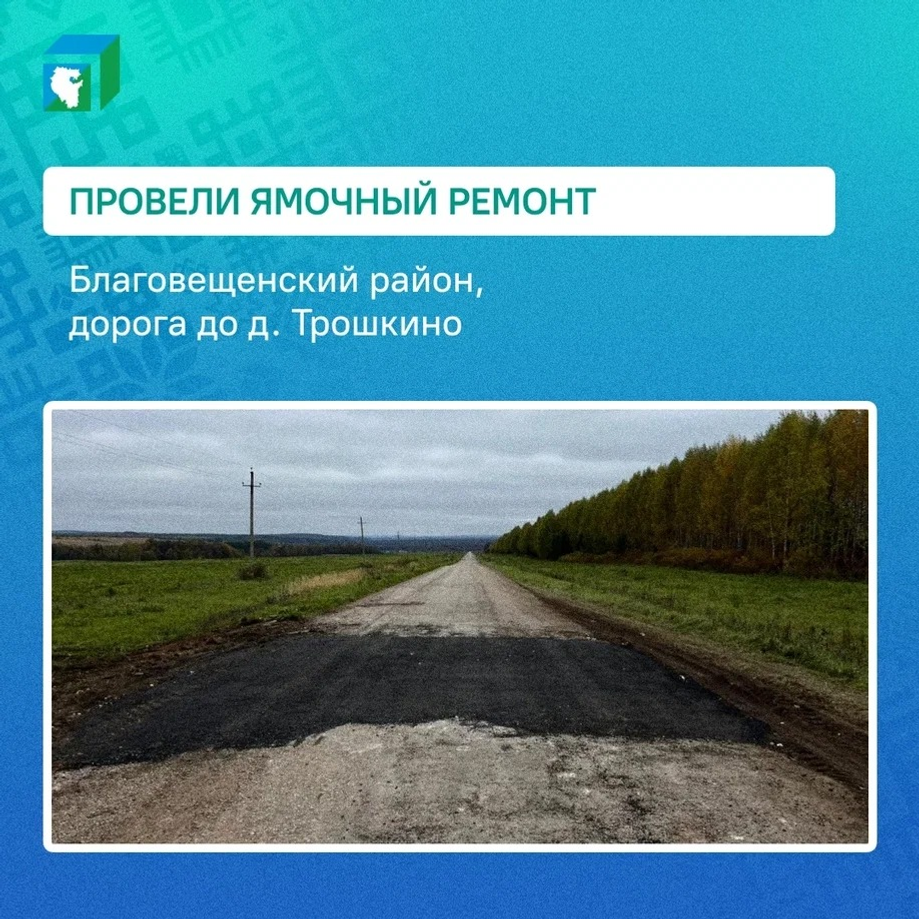 Также обновление завершили на подъезде к деревне Трошкино в Благовещенском районе, где вопрос уже стоял на контроле и дорожники ждали ясной и теплой погоды. Здесь ямочный ремонт закончили 3 октября.