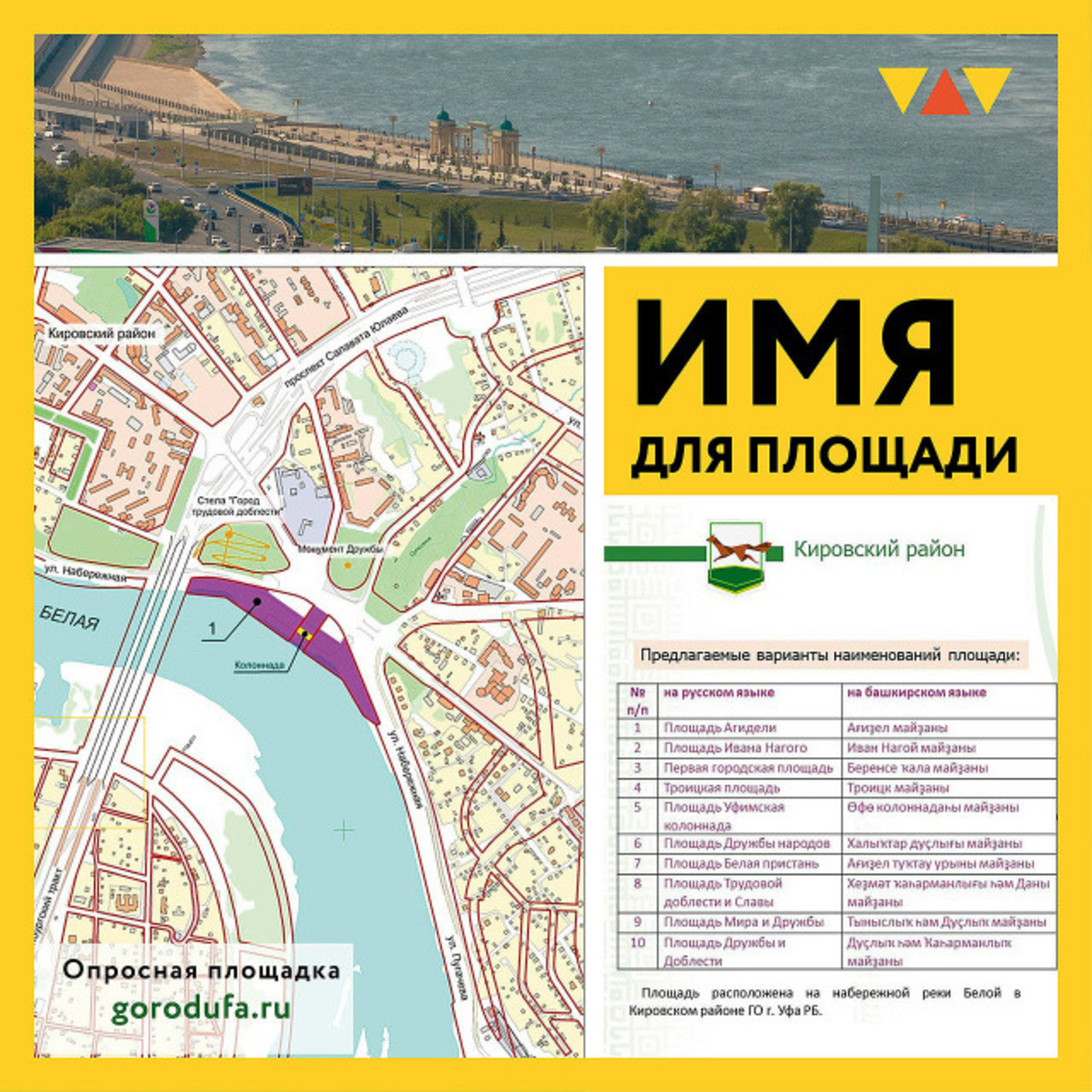 Среди предложенных вариантов названий площади: Троицкая, Дружбы народов, Ивана Нагого, Агидели, Трудовой доблести и славы, Мира и дружбы, Дружбы и доблести, Уфимская колоннада, Белая пристань и Первая городская.