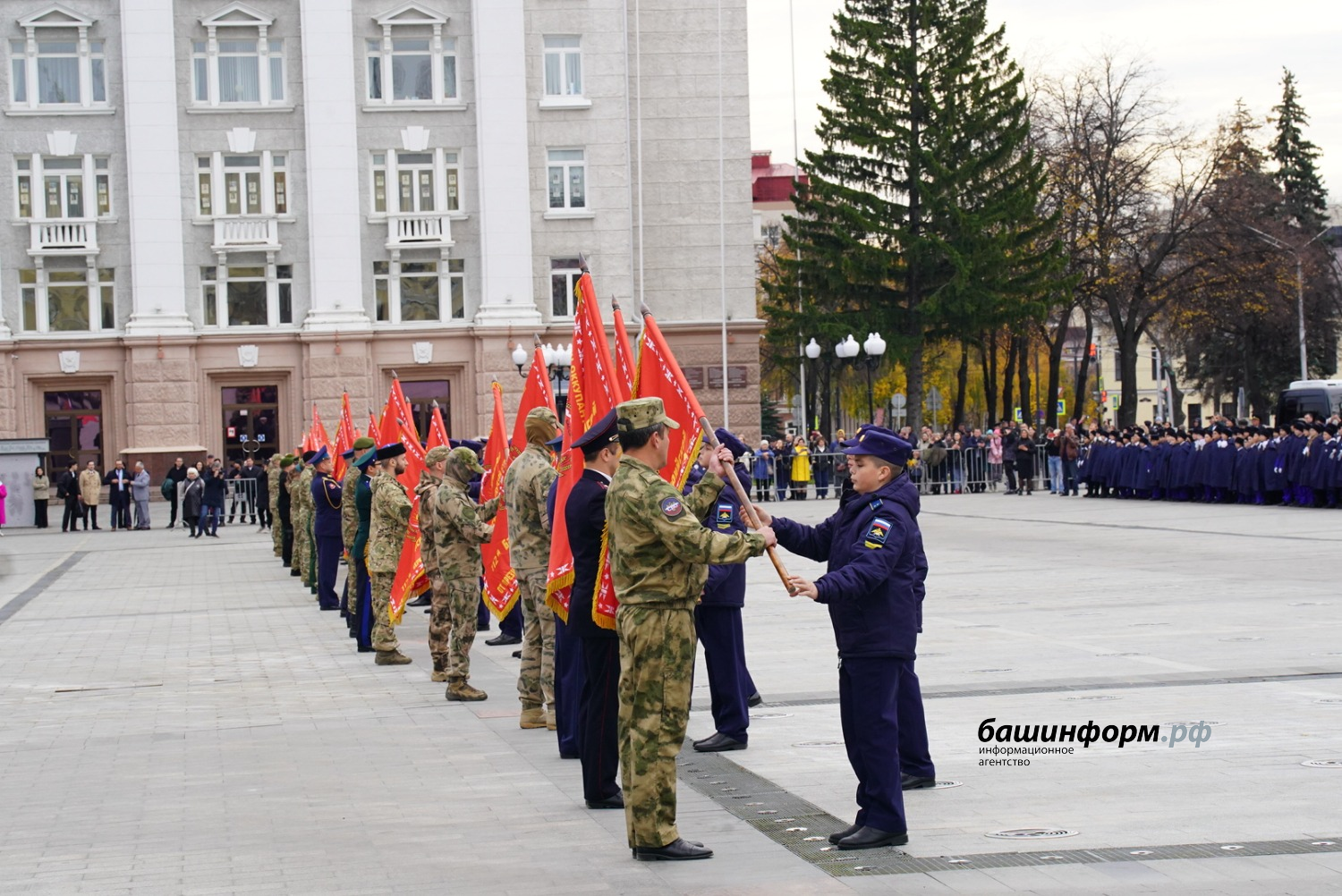 Затем участники СВО передали командирам отрядов знамена «шаймуратовских» классов и ребята прошли торжественным маршем по Советской площади.