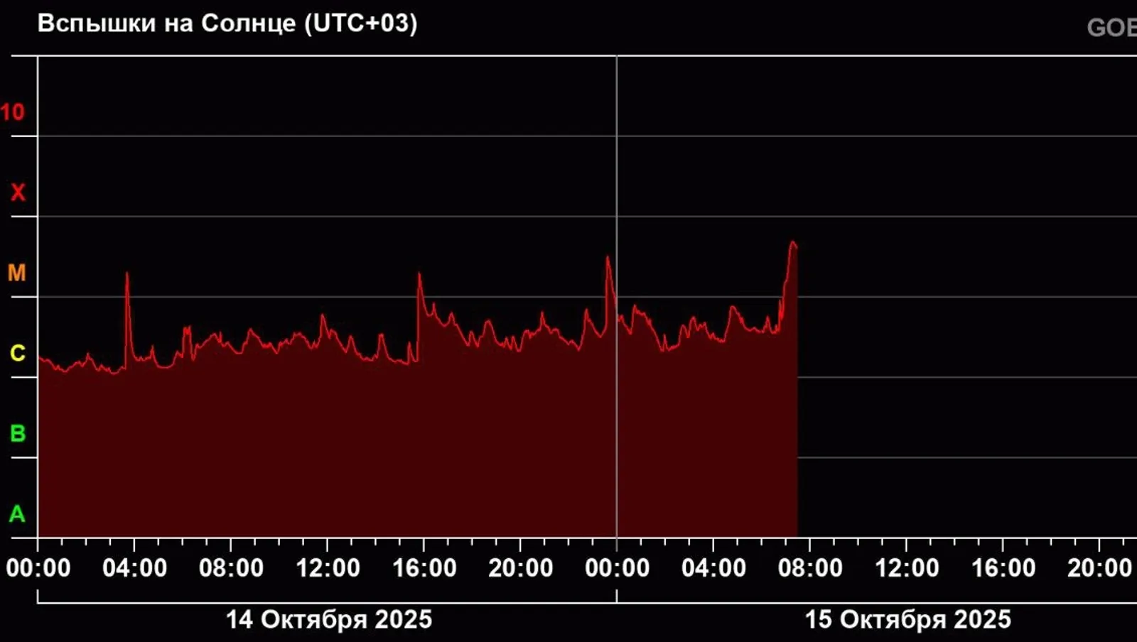 В эти дни на Солнце наблюдается значительное усиление активности. В соответствии с ожиданиями, сегодня может быть достигнут многомесячный пик по силе солнечных вспышек. Графики показывают непрерывный рост фонового излучения Солнца, которое за сутки выросло в 4 раза и приближается к уровню М. Иными словами, Солнце в данный момент даже в отсутствие взрывов формирует потоки рентгеновского излучения на уровне сильных вспышек.