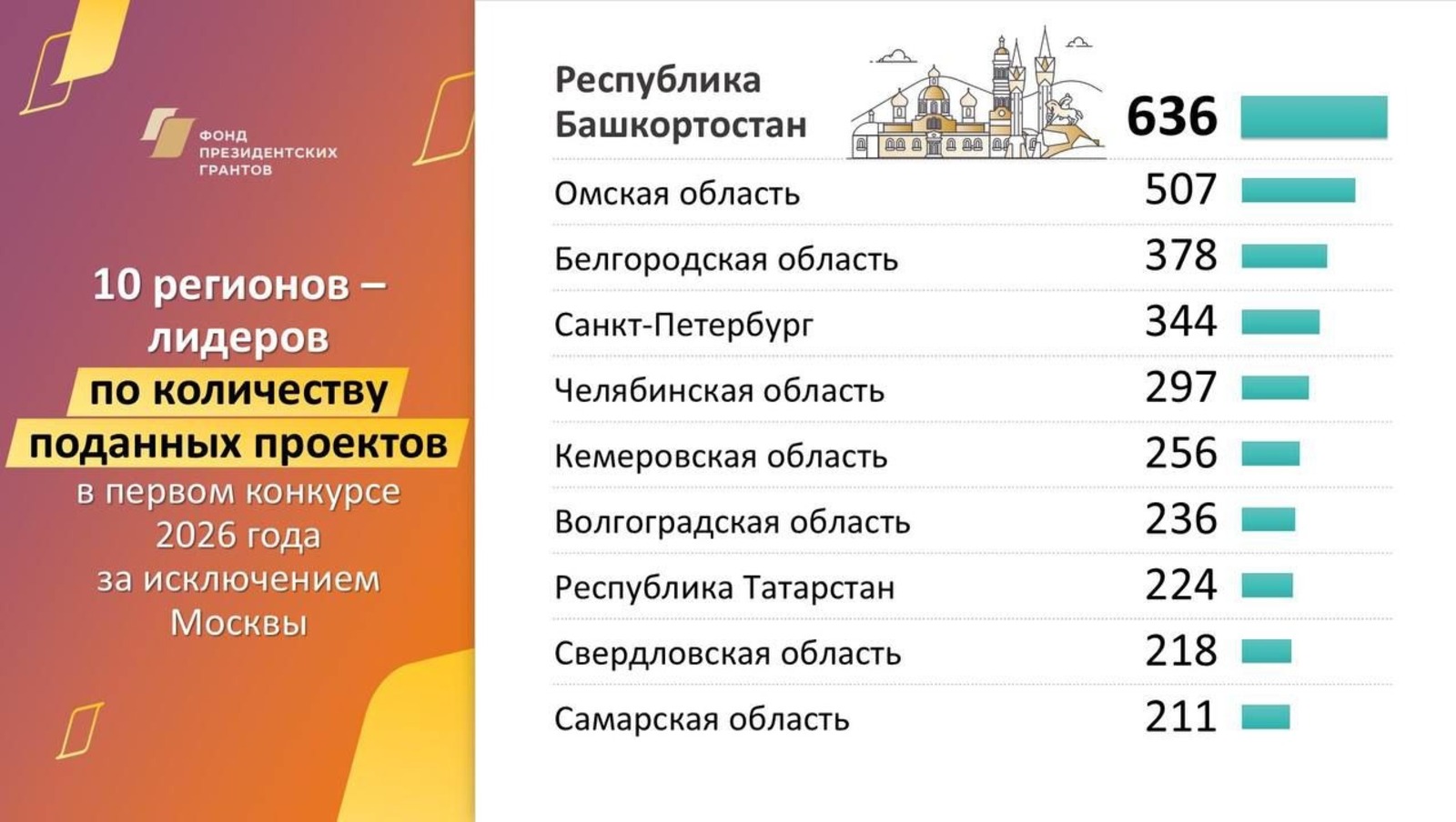 Башкирия возглавила первую строчку рейтинга регионов страны по активности участия в первом конкурсе президентских грантов 2026 года за исключением Москвы. Всего 636 заявок от НКО республики зарегистрировано на сайте Фонда президентских грантов. Следом за нашей республикой расположилась Омская область — 507 заявок, на третьем месте — Белгородская область (378 заявок).