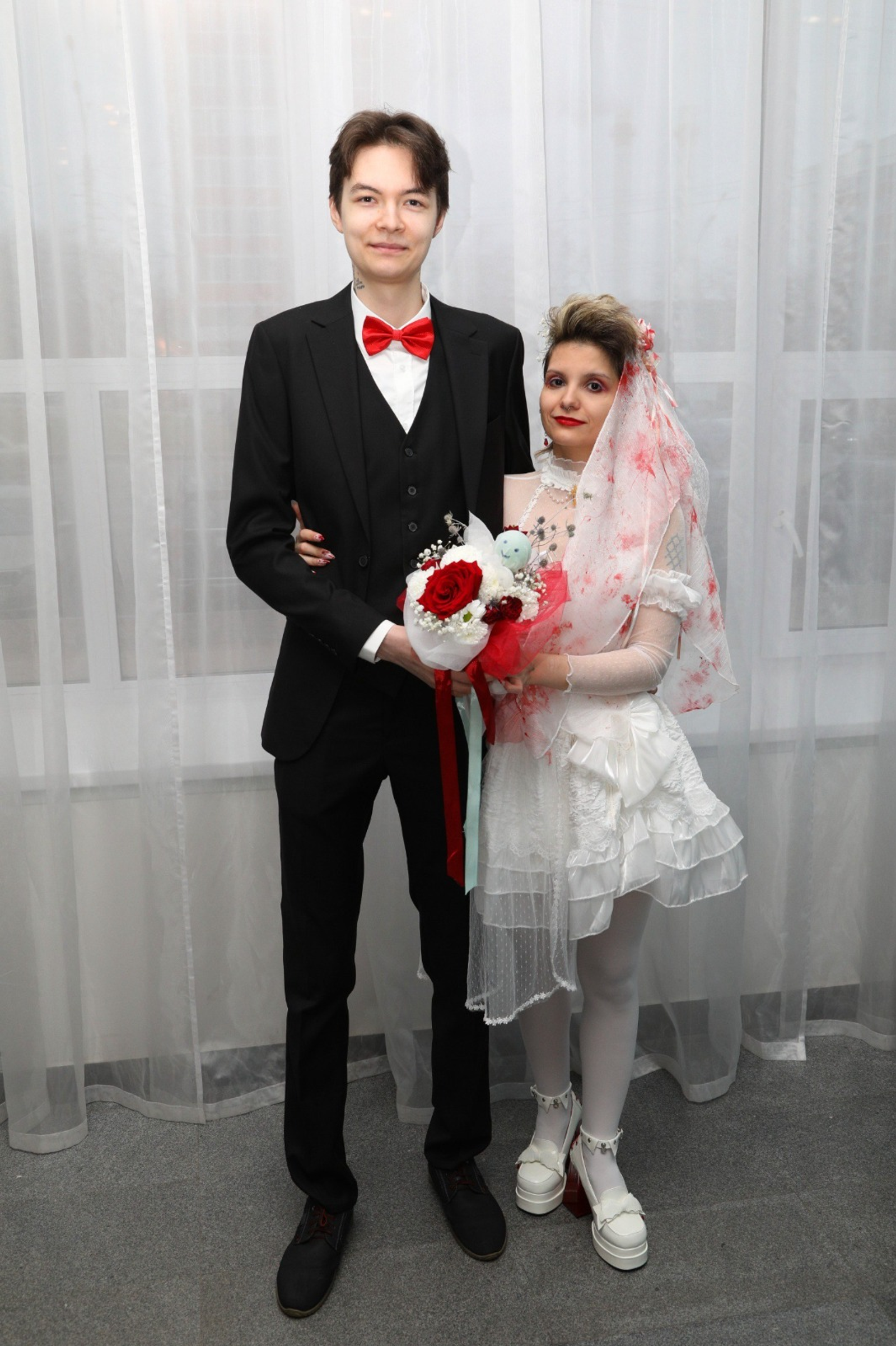 В ЗАГСе Кировского района прошла необычная церемония бракосочетания. В честь праздника Хэллоуина, который отмечается сегодня, молодожены пришли в «жутких» костюмах: новоиспеченная жена была кровавой невестой. Гости также поддержали тематику свадьбы.