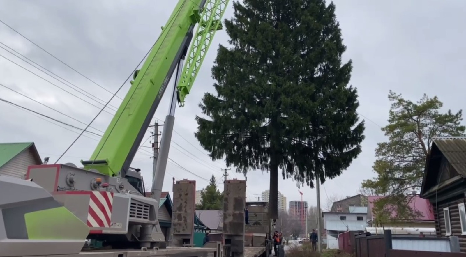 Для праздничного оформления определили огромное дерево, выросшее в частном секторе микрорайона. Его спилили с помощью строительного крана, чтобы не задеть окружающие дома, и сейчас доставляют к месту назначения.