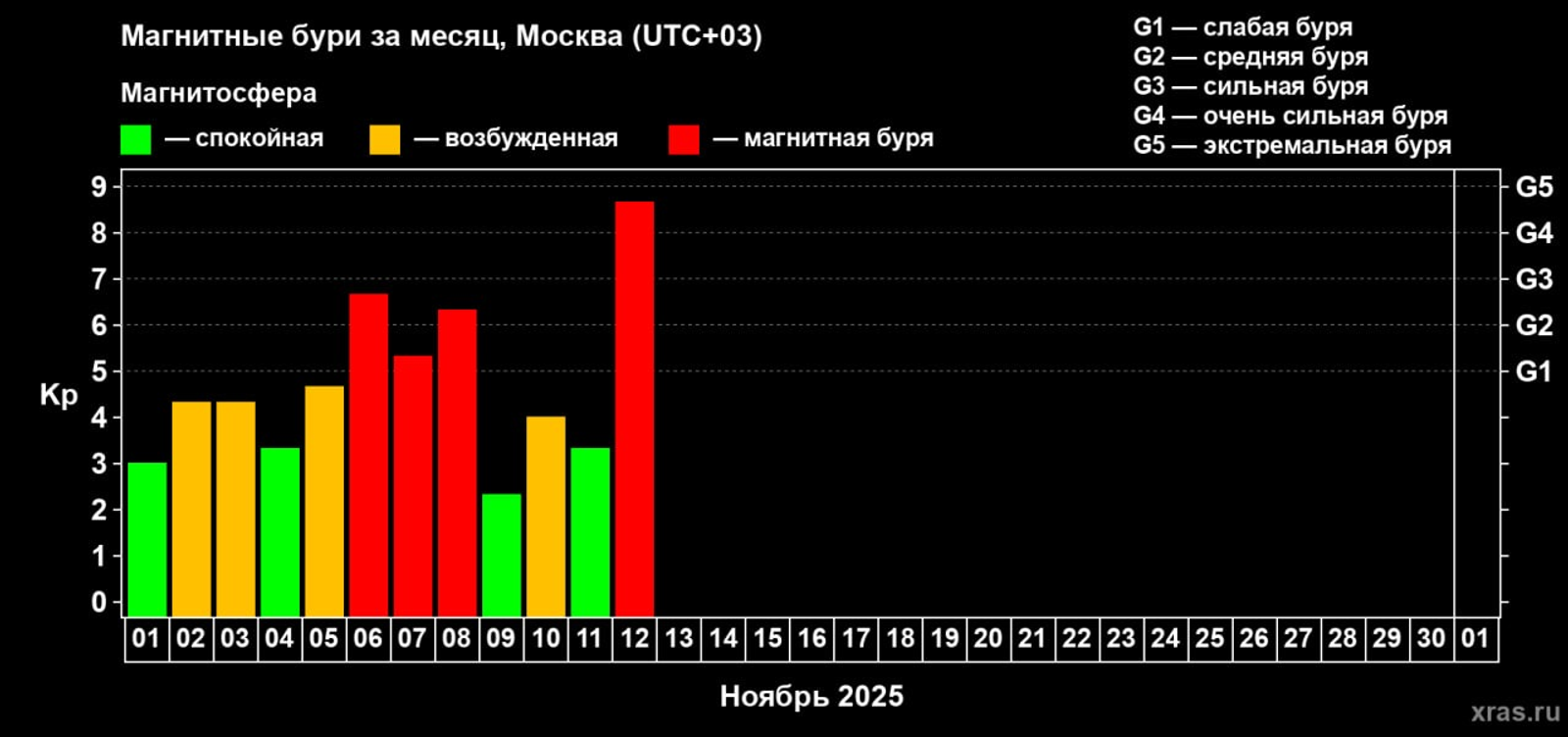 На Земле зарегистрирована магнитная буря уровня G4.66 (максимальная сила возмущения магнитного поля — 5 баллов). Нашей планеты достигло первое из трёх облаков плазмы, накануне выброшенных точно в сторону Земли. В Лаборатории солнечной астрономии отмечают, что прогноз был совершенно другим. Предполагалось, что ночью до нас должен был дойти самый слабый выброс, вызвав бури класса G1-G2. Приход более сильных вспышек ожидался в середине суток.