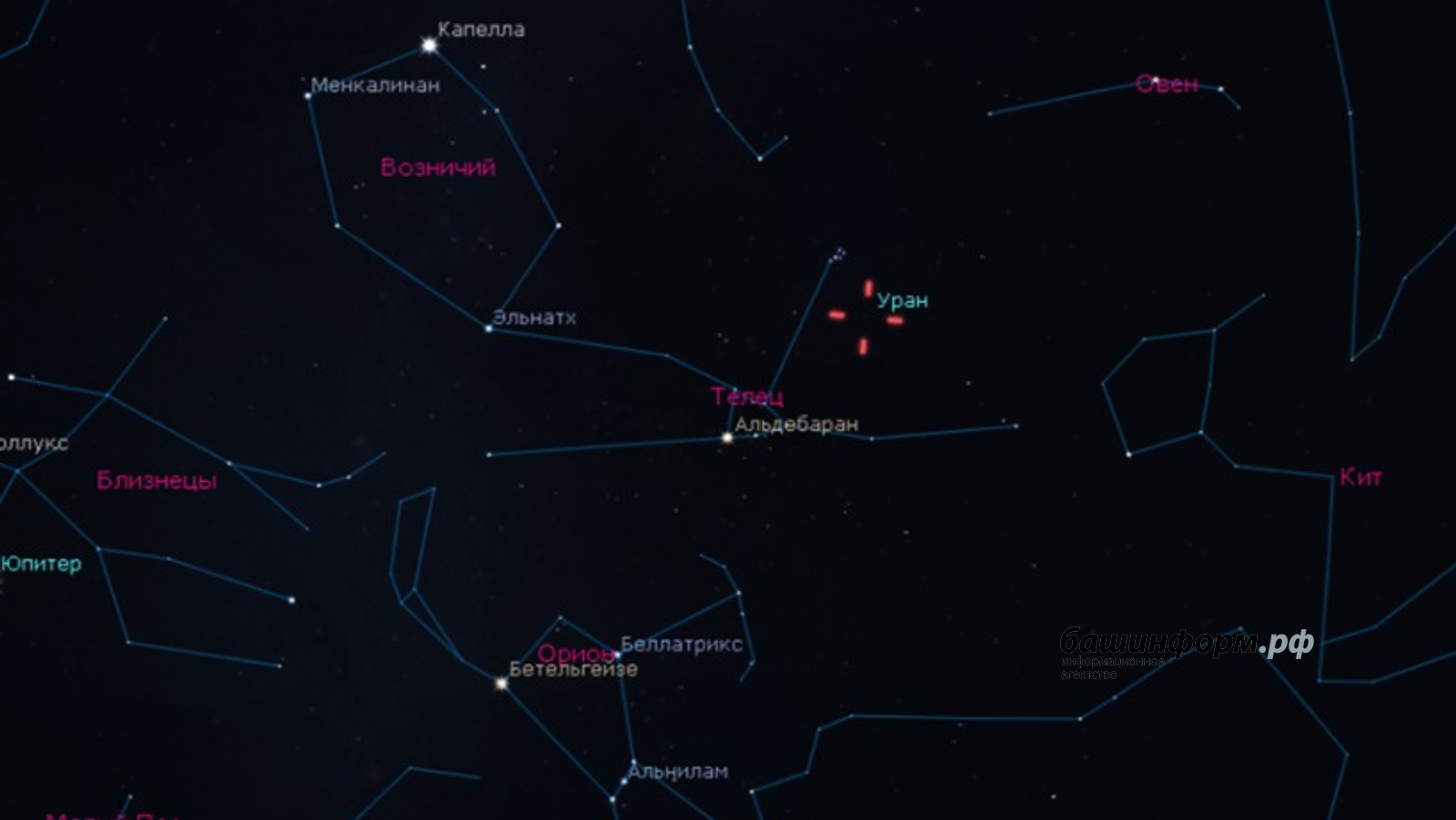 21 ноября Уран восходит вечером на востоке в 16.53 по уфимскому времени и виден всю ночь. На максимальную высоту над горизонтом в 53 градуса он поднимается в час ночи. Заходит утром в 09.12.