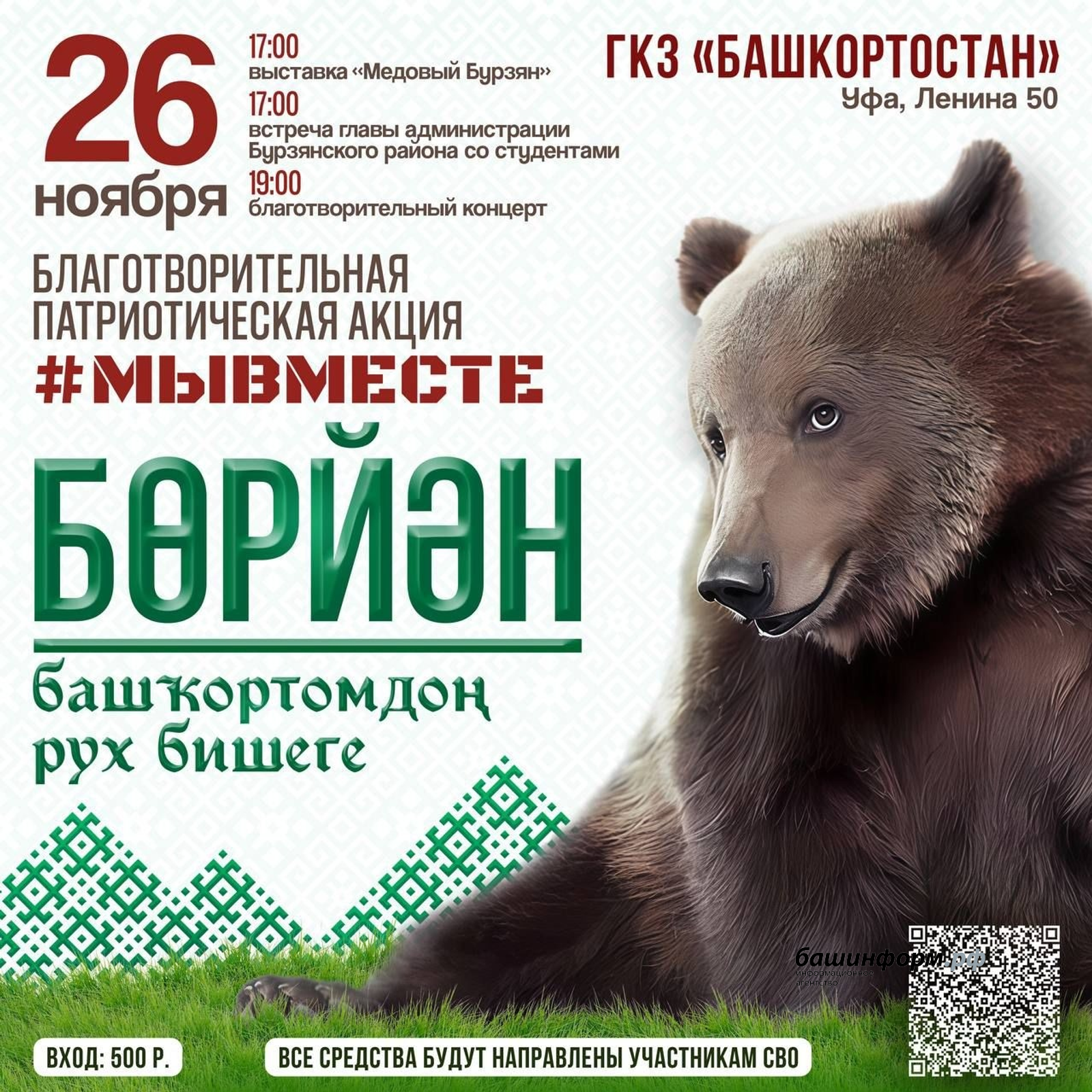 Состоятся встречи с участниками спецоперации, известными писателями, поэтами, деятелями науки, спорта и культуры. В фойе дворца будет организована выставка-продажа бурзянского меда. Запланирован концерт мастеров искусств.