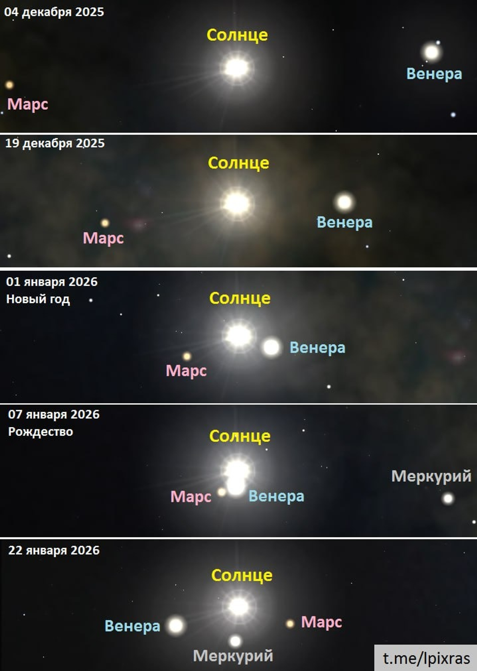 На небе формируется солнечный парад планет. Впервые с 2019 года вокруг Солнца сойдутся Венера, Марс и Меркурий. Первыми на подходе Венера и Марс, в январе к ним присоединится Меркурий, и 22 января все три планеты окажутся на минимальном среднем угловом расстоянии от Солнца, образовав вместе с ним почти ровную ромбовидную конфигурацию, рассказали в Лаборатории солнечной астрономии. После этого построение начнёт быстро распадаться. Первым, ещё до конца января, отойдёт Меркурий, затем в течение февраля удалятся Венера и Марс.