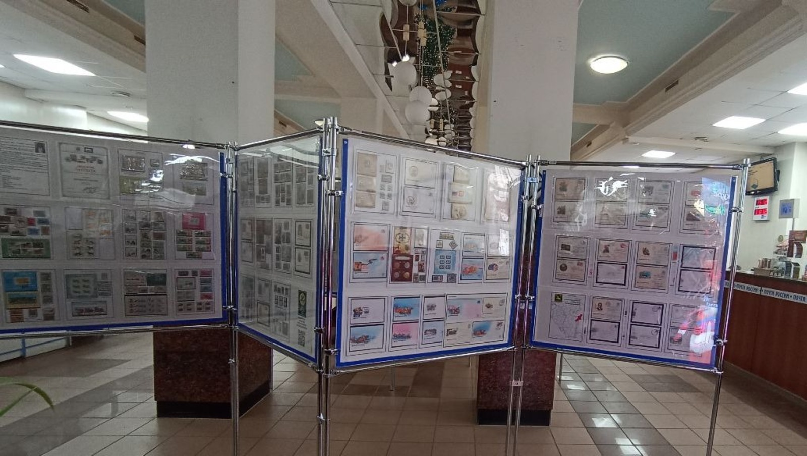 Экспонаты выставки размещены в клиентском зале Уфимского почтамта. Здесь собраны почтовые конверты, марки и оттиски специальных почтовых штемпелей, тематика которых связана с праздником Нового года.