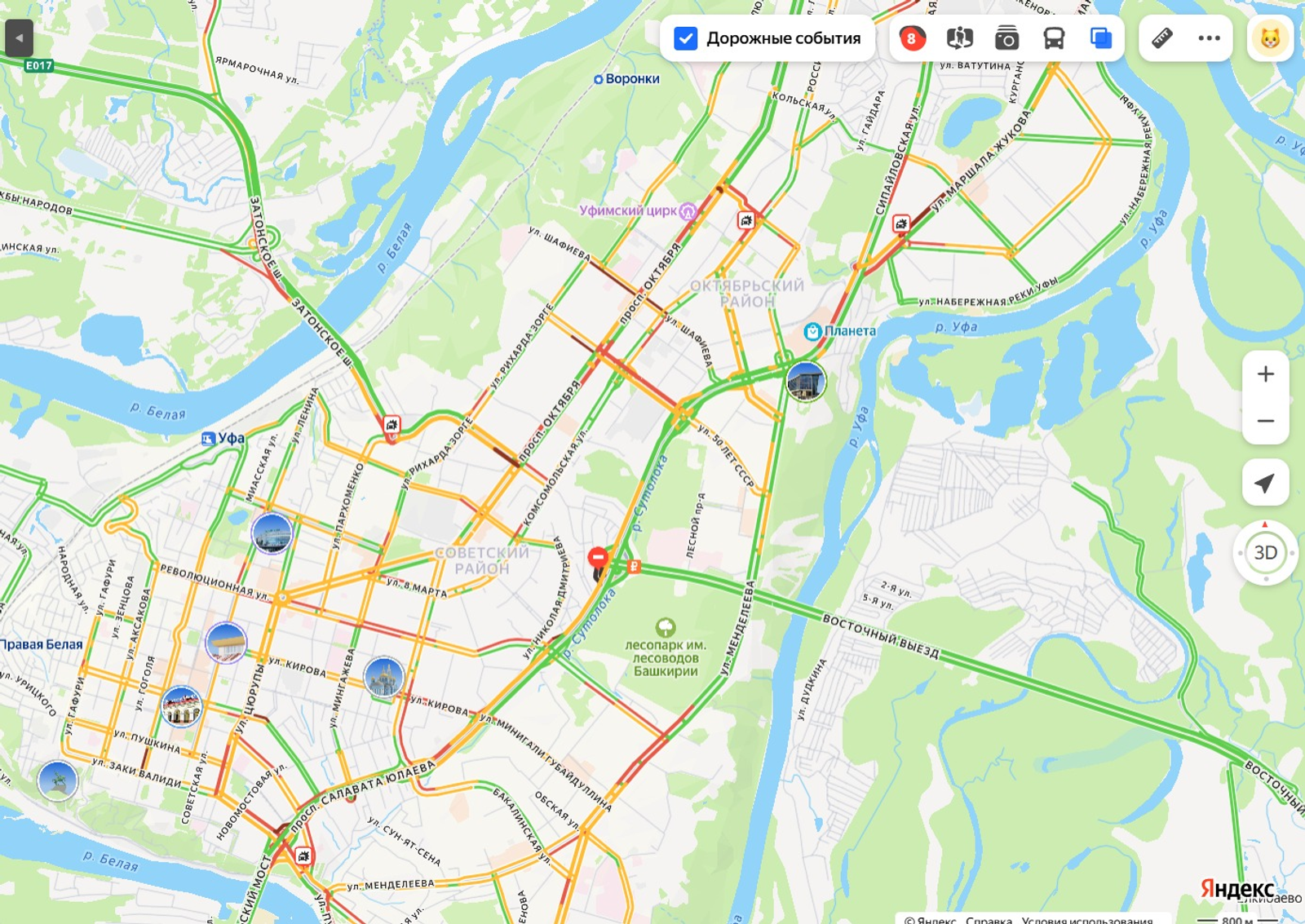 Утром 23 декабря в Уфе пробки достигли 8 баллов. По данным сервиса «Яндекс. Пробки», сильнее всего затруднено движение на проспекте Октября, а также на улицах 8 Марта, 50-летия Октября, 50 лет СССР, Кирова, имени Города Галле, Рихарда Зорге, Карла Маркса, Заки Валиди, Менделеева, Сочинской, Софьи Перовской, Степана Кувыкина и других.