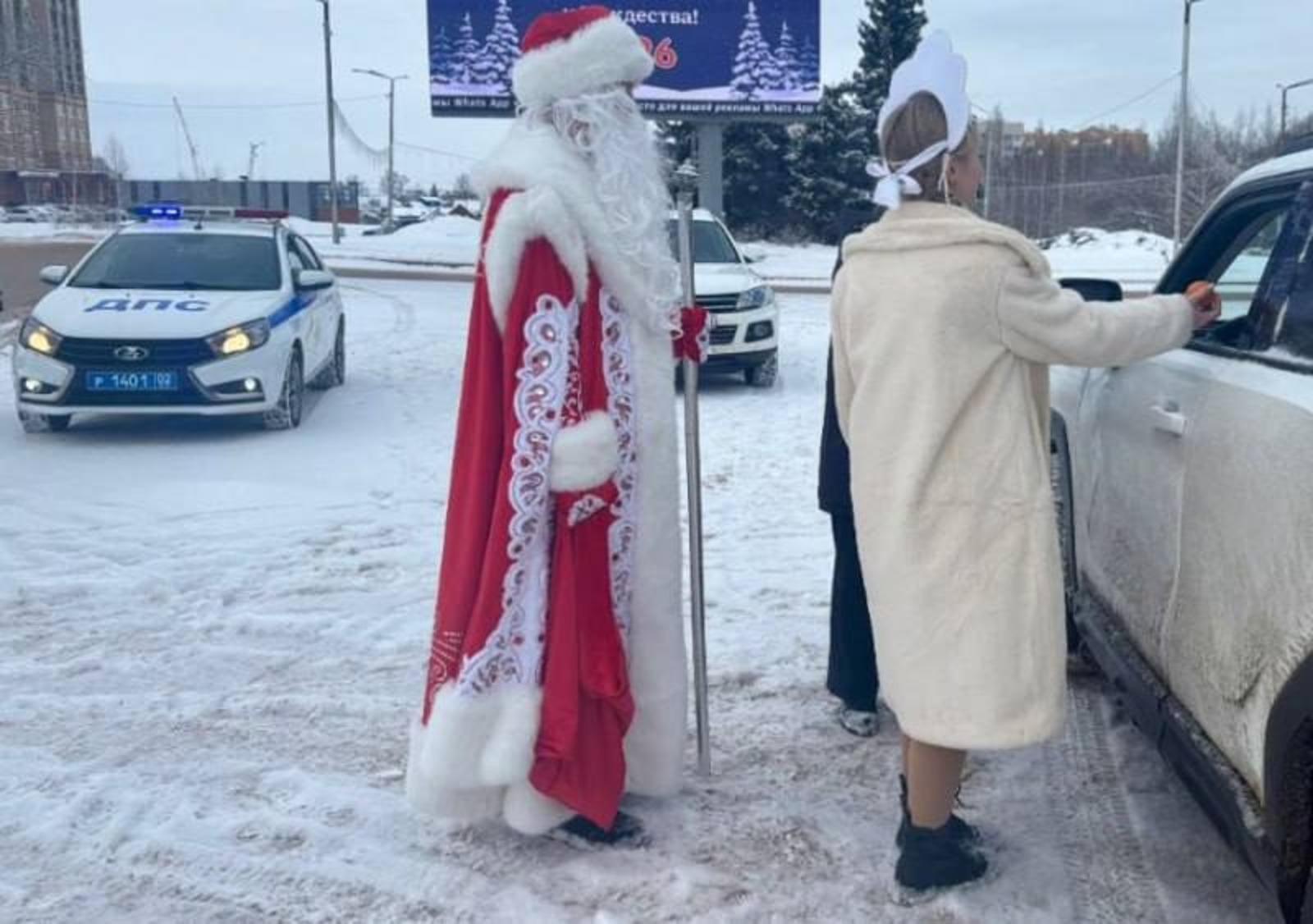 На улицах города Октябрьский в канун Нового года дежурил необычный патруль. Автолюбителей останавливали полицейский Дед Мороз и Снегурочка. Зимние волшебники поздравляли горожан с праздникам, вручали небольшие подарки и памятки по безопасности движения.