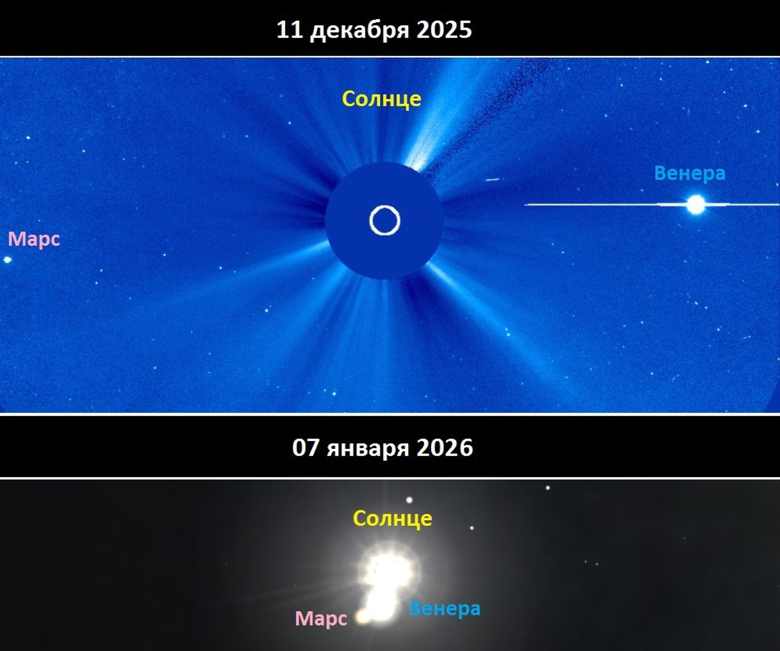 В течение 7 января на небе соединятся с Солнцем две соседние с Землёй планеты — Венера и Марс. К концу завтрашнего дня они подойдут к светилу на минимальное расстояние — менее 1 градуса, и выстроятся примерно в одну линию.