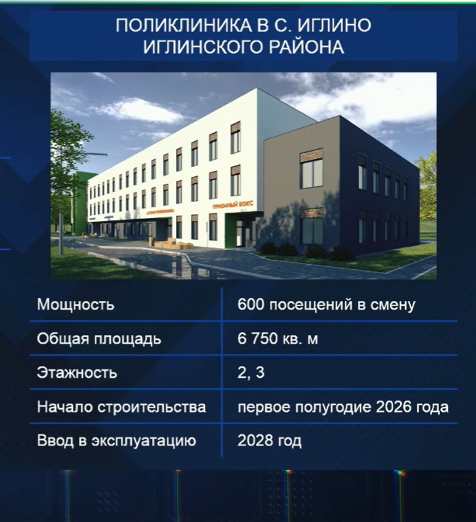 Строительство поликлиники в Иглино уже начато. Выделены бюджетные средства в сумме более 227 млн рублей. До 2028 года объект обещают сдать в эксплуатацию. Мощность медучреждения составит 600 посещений в смену. Здесь будут размещены 6 терапевтических и 6 педиатрических участков, стоматологическое отделение, отделение функциональной диагностики, рентгенодиагностический комплекс.