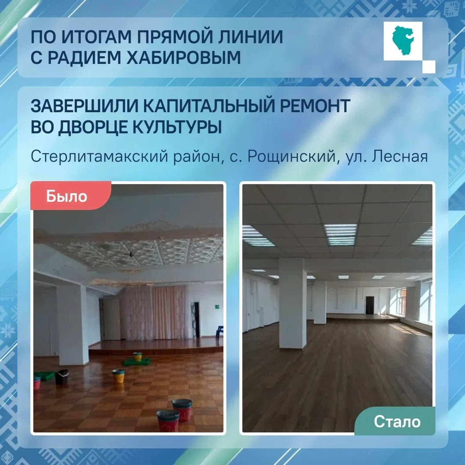 Во Дворце культуры села Рощинский завершили капитальный ремонт. Работы инициировали после обращения жителей, которое они направили на Прямую линию Главы Башкирии Радия Хабирова-2024, информирует ЦУР.