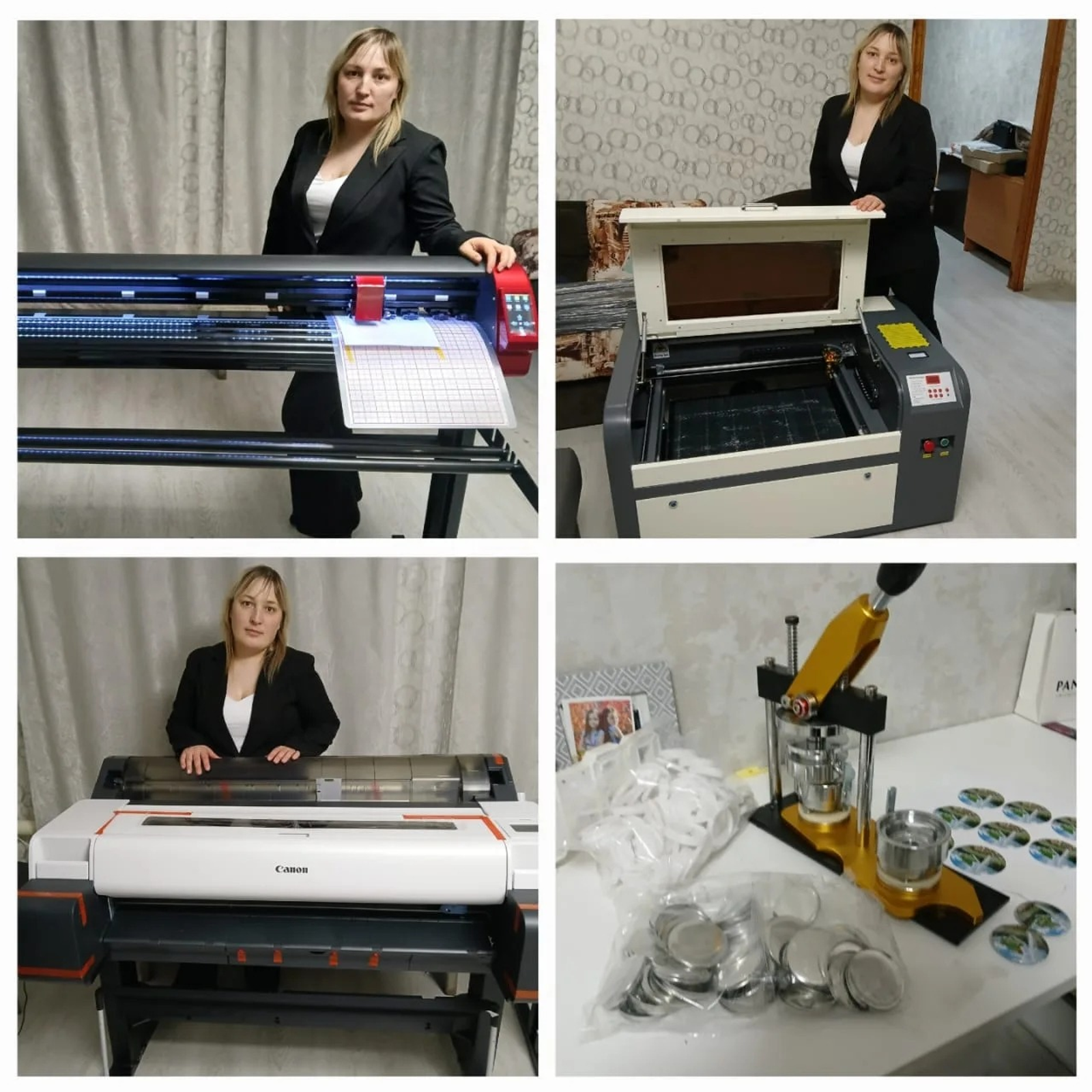 В 2025 году Оксана выиграла конкурс и на полученные средства закупила широкоформатный и режущий плоттеры, а также лазерный станок для изготовления сувениров. Это значительно расширило творческие и производственные возможности мастерской.