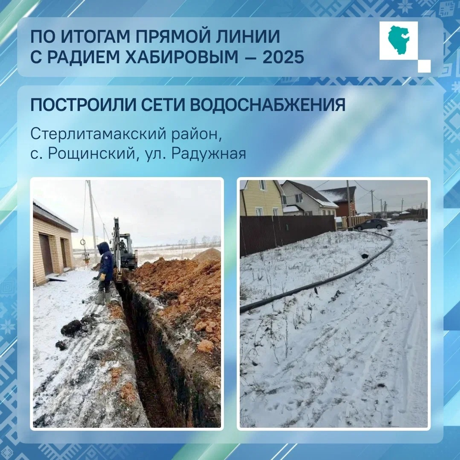 Сети центрального водоснабжения построили в селе Рощинский на улице Радужной после обращения местных жителей на Прямую линию-2025 с Главой Башкирии Радием Хабировым. Об этом рассказали в ЦУР РБ.