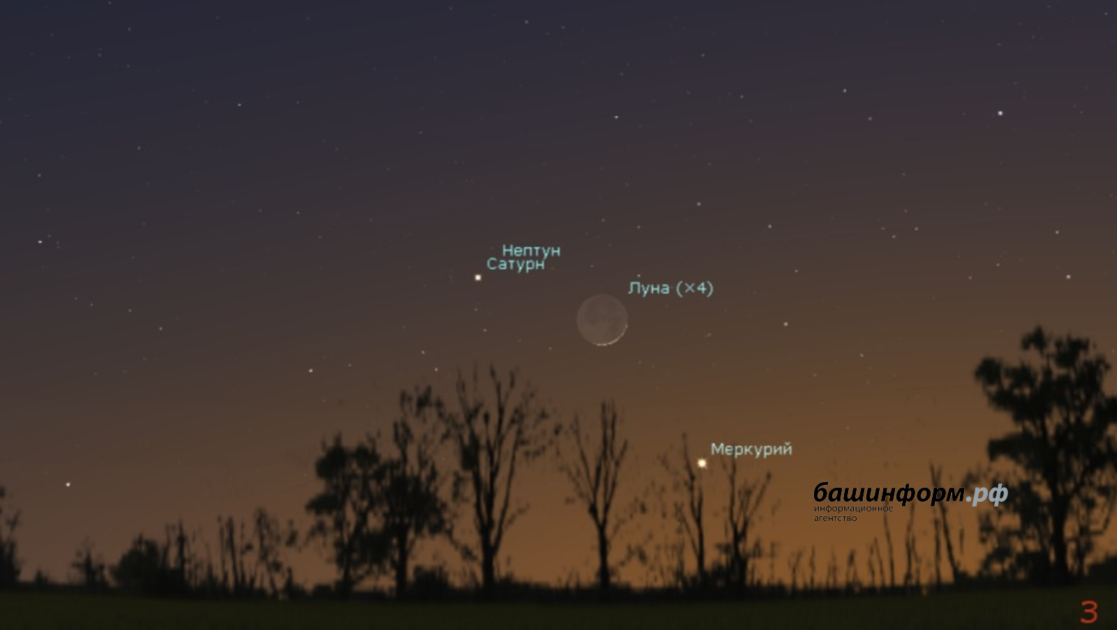 19 февраля его поможет отыскать Луна: Меркурий будет виден ниже и немного правее узкого лунного серпика. Заходит Меркурий за горизонт в 20.21 по уфимскому времени.
