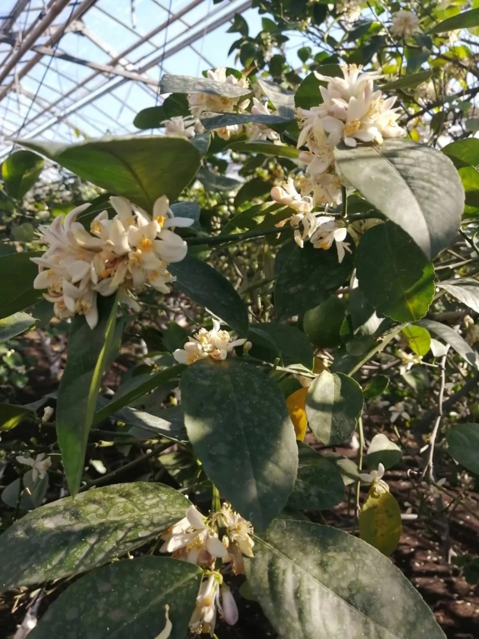 В теплицах начали распускаться бело-жёлтые цветы, а на некоторых деревьях уже завязались плоды. Цветки лимона источают аромат, напоминающий жасмин, создавая атмосферу настоящих тропиков.