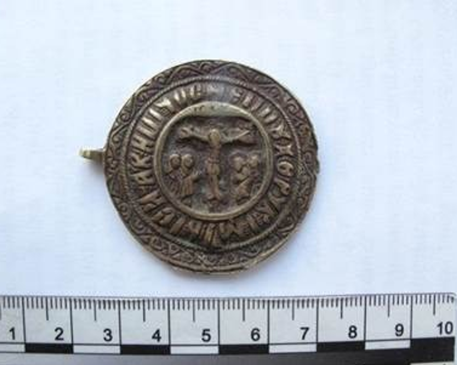 Между тем панагия — иконка, которую носят на груди поверх облачения архиереи, это отличительный атрибут высокого церковного сана. Экспертиза подтвердила историческую и культурную ценность находки: часть панагии «Троица Ветхозаветная» изготовлена в первой половине XIX века из медного сплава.