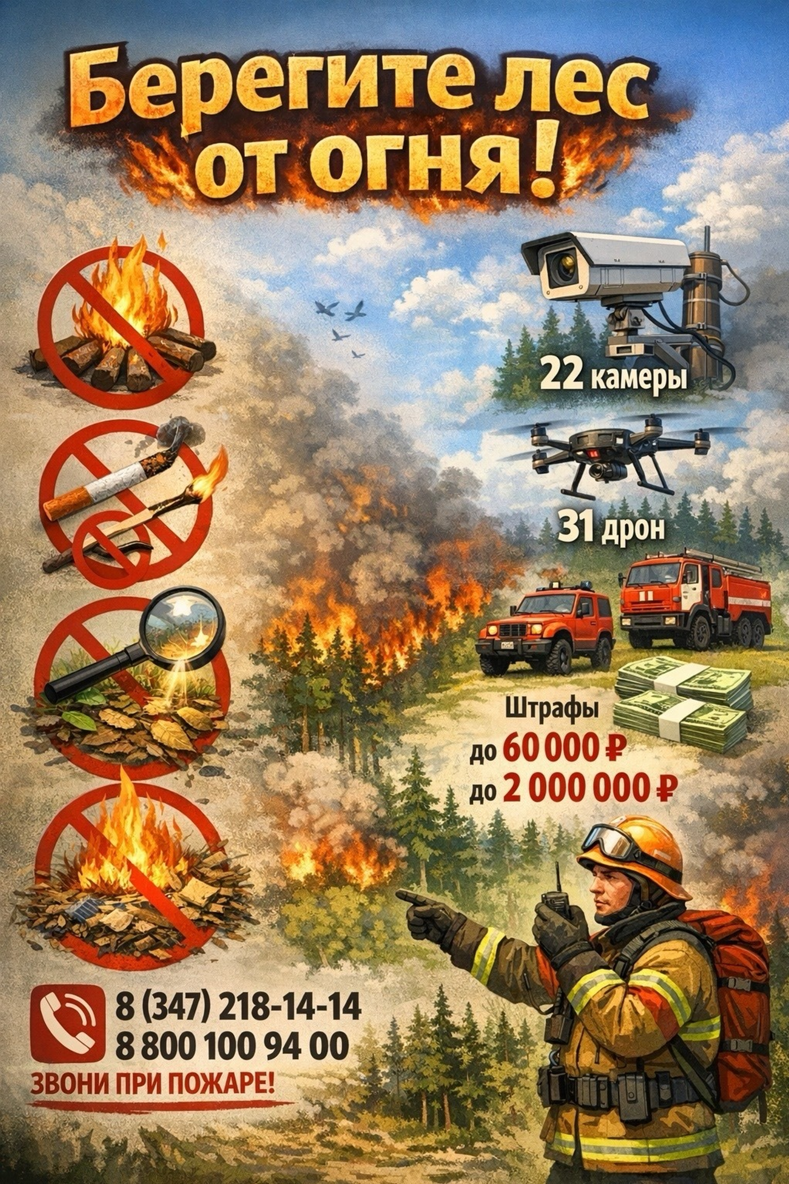 «Как в республике борются с огнем? У нас уже работают 22 камеры «Лесохранитель» (в плане – еще 35), 31 дрон и сотни единиц новой техники по нацпроекту «Сохранение лесов». При обнаружении пожара звоните: 8 (347) 218-14-14 — региональная диспетчерская служба 8 800 100 94 00 — единый номер лесной охраны», — говорится в сообщении.