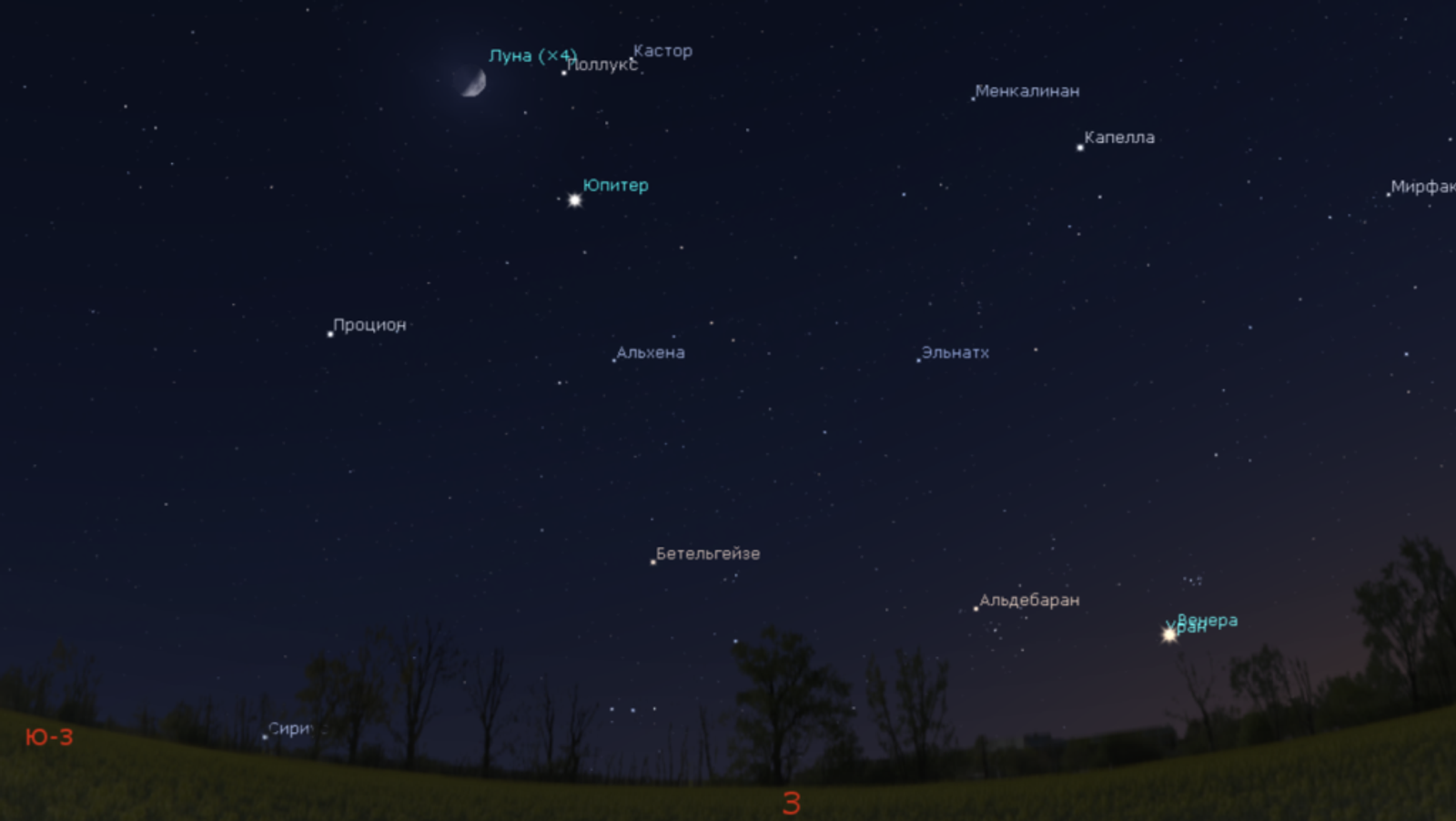По данным Уфимского городского планетария, вечером 22 апреля Юпитер будет виден слева от Луны. Луна, в фазе близкой к первой четверти, будет выглядеть как серп. Солнцем будет освещено 34% лунного диска. Светила встретятся в созвездии Близнецов и будут видны до трех часов ночи. Они почти одновременно зайдут за горизонт на северо-западе.