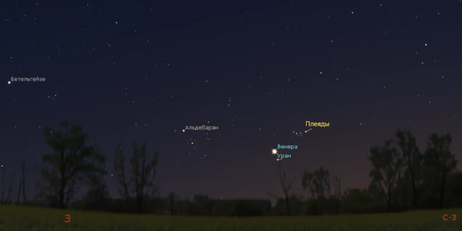 По информации Уфимского городского планетария, Венеру, как самую яркую звезду, будет прекрасно видно невооруженным глазом уже на фоне зари после захода Солнца. А вот Уран так увидеть не удастся: нужен будет бинокль или телескоп. Но и в телескоп он будет выглядеть как слабая немерцающая звездочка бледно-зеленоватого оттенка.