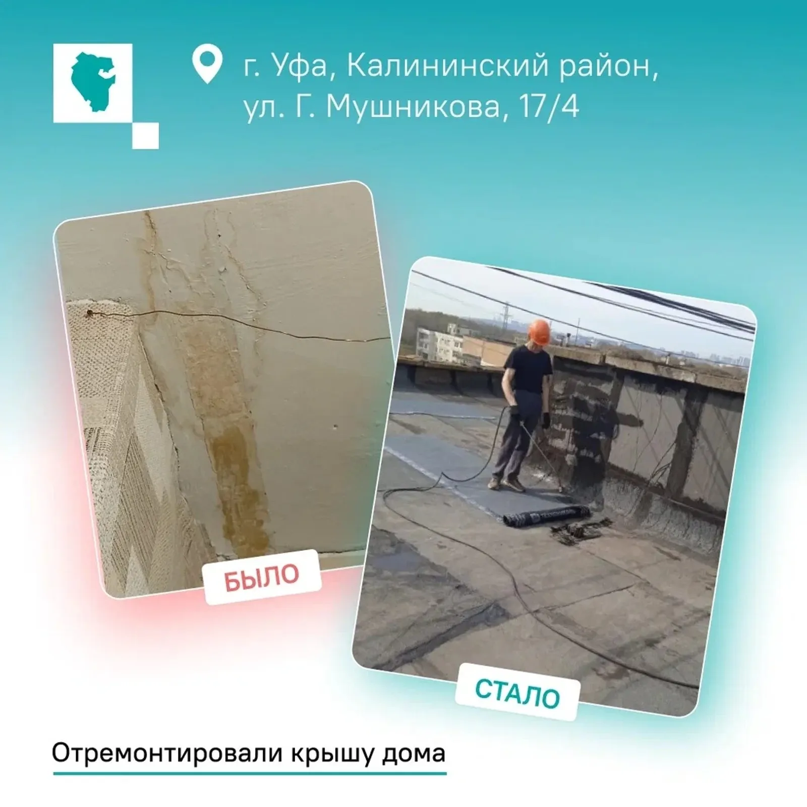 Ремонт крыши жилой девятиэтажки на улице Георгия Мушникова, 17/4 в столице республики выполнили специалисты местного ЖЭУ. Ранее в марте 2026 года о протекающей кровле написала одна из жительниц.