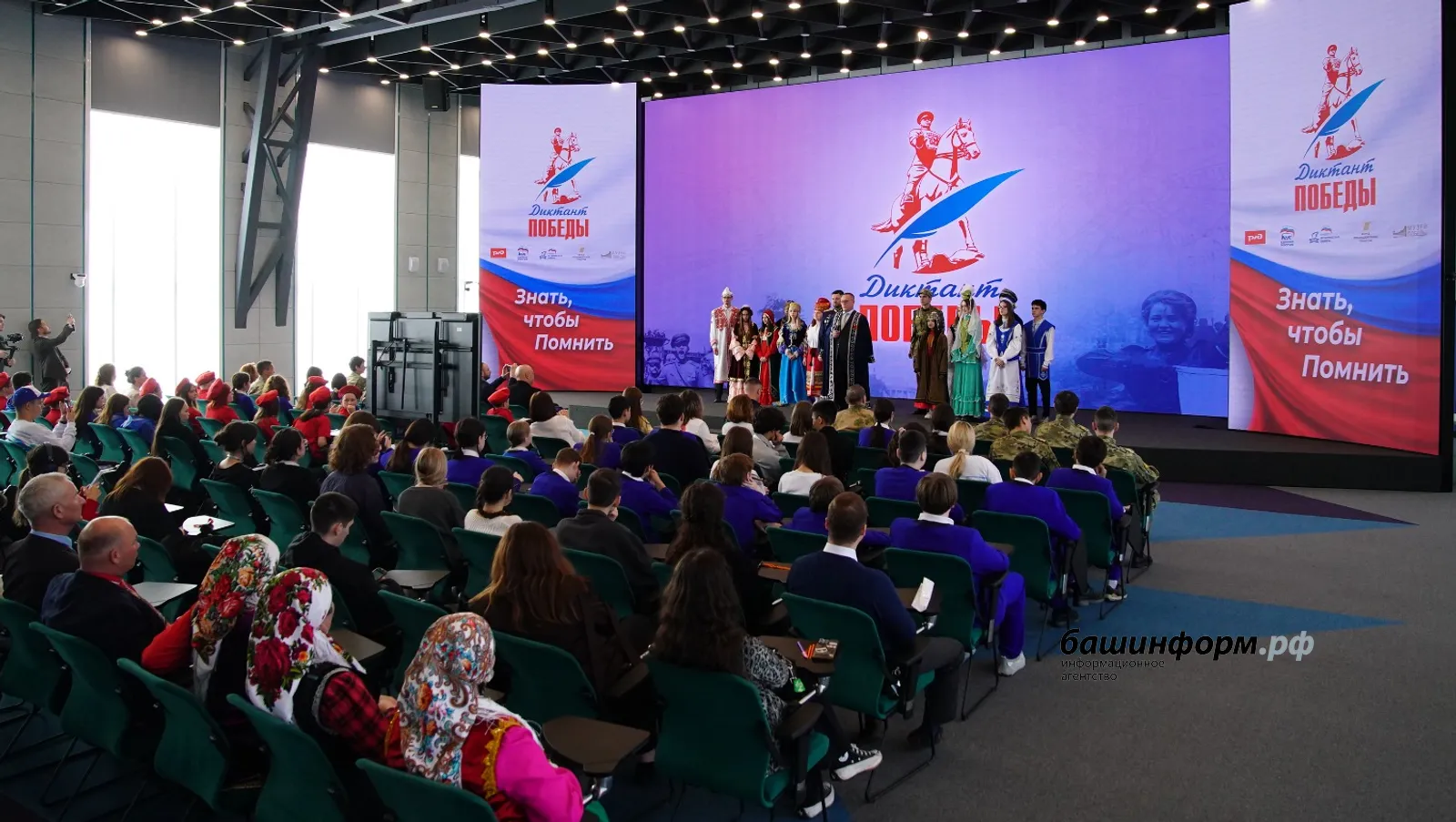 «Добрый день, уважаемые товарищи, дорогие друзья! Башкортостан приветствует центральную площадку „Диктанта Победы“ и каждого участника нашей патриотической акции в Москве, в других городах России, за рубежом. Наша главная площадка сегодня находится в Уфе — Городе трудовой доблести. Здесь в годы Великой Отечественной войны люди разных национальностей, даже дети, ковали победу над нацизмом. Также и сейчас башкортостанцы — а нас в республике проживает более 130 национальностей и народностей — объединились ради одной цели, ради победы, — подчеркнул он. — Мы находимся в Геномном центре Межвузовского студенческого кампуса Евразийского НОЦ мирового уровня. Здесь, в точке роста будущего, мы говорим о столь важном и объединяющем нас в прошлом. Диктант пишется сегодня и в историко-краеведческом музее Ишимбая — ещё одном Городе трудовой доблести, который снабжал топливом могучие танки Красной армии. Диктант пишется в визит-центре Турахан Чишминского района — памятника древности XIV–XV веков. Пишется в лицее № 3 города Стерлитамак, в интерактивном музее, где хранится тысяча документов о фронтовиках, о ветеранах Великой Отечественной войны. Диктант пишется в музее Шульган-Таш — объекте ЮНЕСКО с палеолитической живописью. Это значит, что глубочайшая древность сегодня идёт рука об руку с памятью современников».