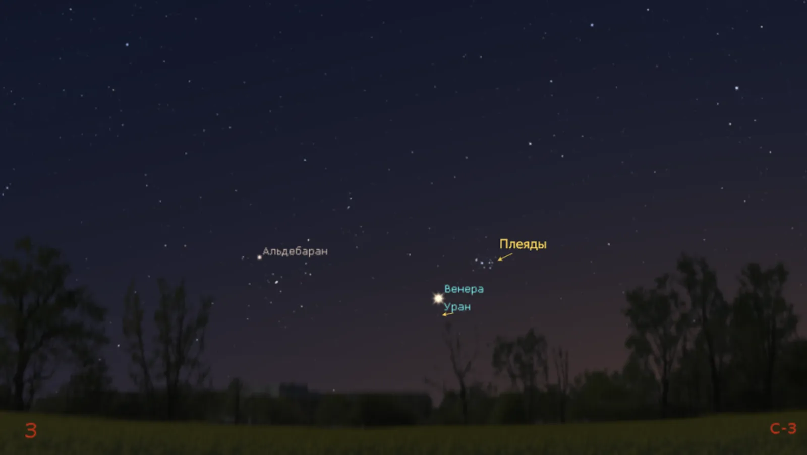 Венеру, как самую яркую звезду, будет прекрасно видно невооруженным глазом уже на фоне зари после захода Солнца. А вот Уран так просто увидеть не удастся: нужен будет бинокль или телескоп. Но и в телескоп он будет выглядеть как слабая немерцающая звездочка бледно-зеленоватого оттенка.