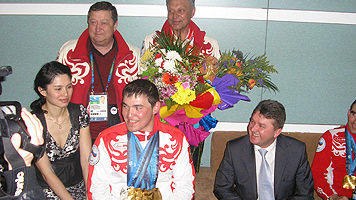 - Сегодня мы собрались здесь, чтобы встретить наших дорогих, уважаемых героев, которые защищали честь Республики Башкортостан, честь России на Паралимпийских играх в Ванкувере. Я предлагаю одним возгласом «Поздравляю!» еще раз поприветствовать наших дорогих и уважаемых спортсменов!