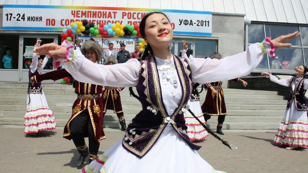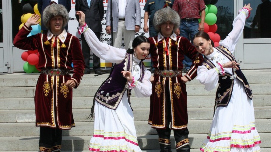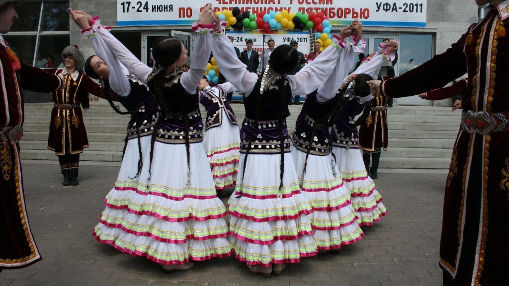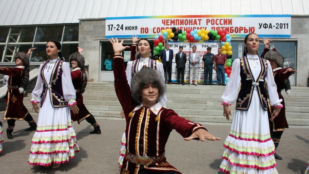 После государственных гимнов России и Башкортостана свое мастерство показали танцоры фольклорного ансамбля народного танца «Мирас». Их выступление вызвало бурные эмоции у приезжих спортсменов-пятиборцев.