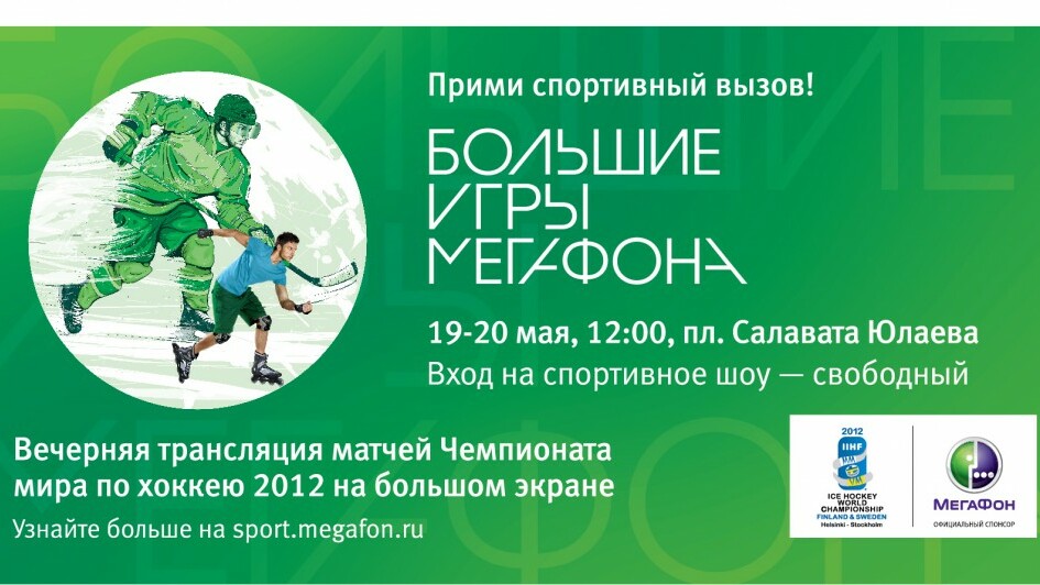 19 и 20 мая в Уфе пройдет Фестиваль инноваций и спорта «Большие Игры МегаФона». Жители и гости города смогут почувствовать себя участниками зимней Олимпиады и попасть в фан-зону прямой трансляции финальных игр «Чемпионата мира по хоккею 2012».