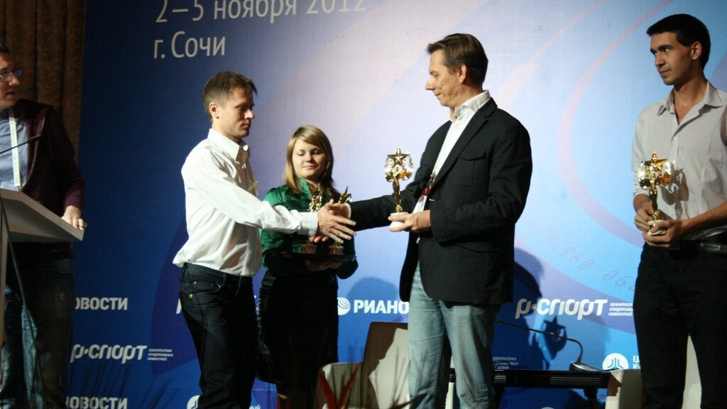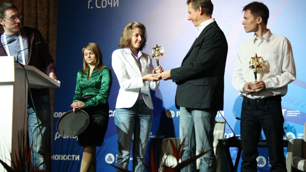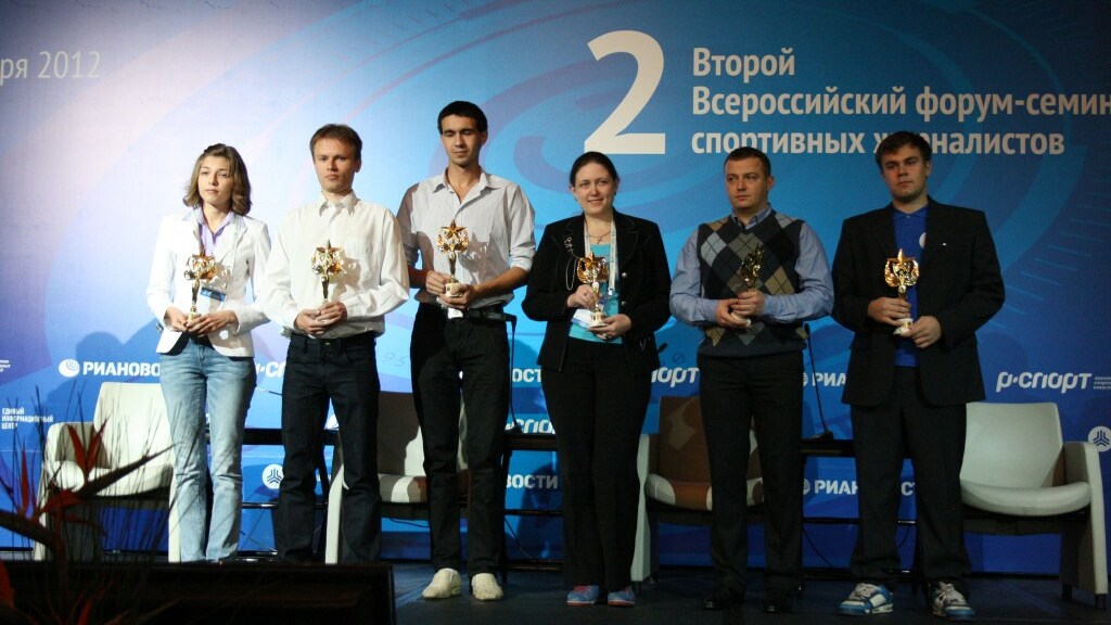Далее были награждены участники еще одного конкурса – среди не профессионалов журналистики. Участники этого испытания, победитель которого сможет отправиться в составе команды агентства РИА Новости на Олимпиаду-2014, подали свои заявки и представили конкурсные работы по темам «Олимпийские виды спорта в моем городе» и «Спортивная судьба». Во второй этап конкурса пробились: Александр Бабенко (Тюмень), Евгения Баксанова (Калуга), Илья Иванов (Нурлан, Татарстан), Дмитрий Коротышев (Набережные Челны), Даниил Кузнецов (Ярославль) и Анна Манакова (Омск). На втором этапе полуфиналистам предстоит недельная стажировка в московской редакции агентства «Р-Спорт». По его итогам определятся еще три счастливчика, которые получат право освещать XXVII Всемирную летнюю Универсиаду-2013 в Казани. В результате этой работы в столице Татарстана и будет определен победитель конкурса «Счастливый билет в Сочи».