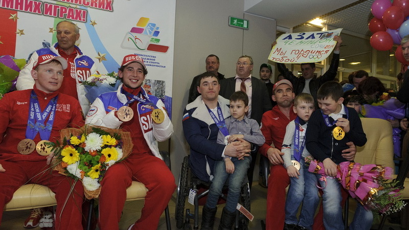 Сегодня рано утром в Уфу прилетели победители и призеры зимних Паралимпийских игр в Сочи Ирек Зарипов, Кирилл Михайлов, Азат Карачурин, Александр Давидович, а также их тренеры.